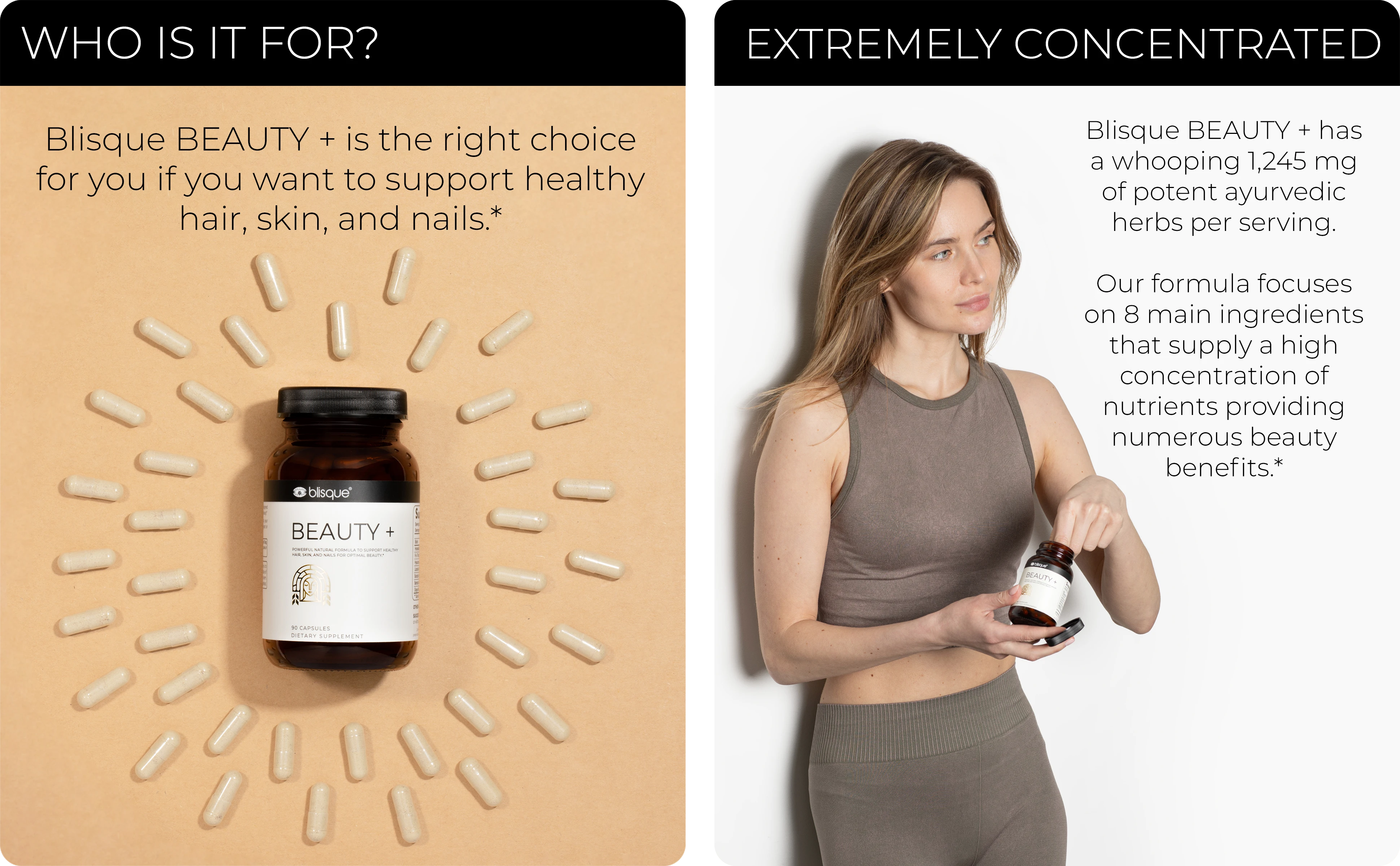 RADIANT HAIR: Discover the key to stunning hair care with Blisque BEAUTY +. Our supplement, enriched with powerful herbs, biotin, and hyaluronic acid, encourages strong and beautiful hair growth.*