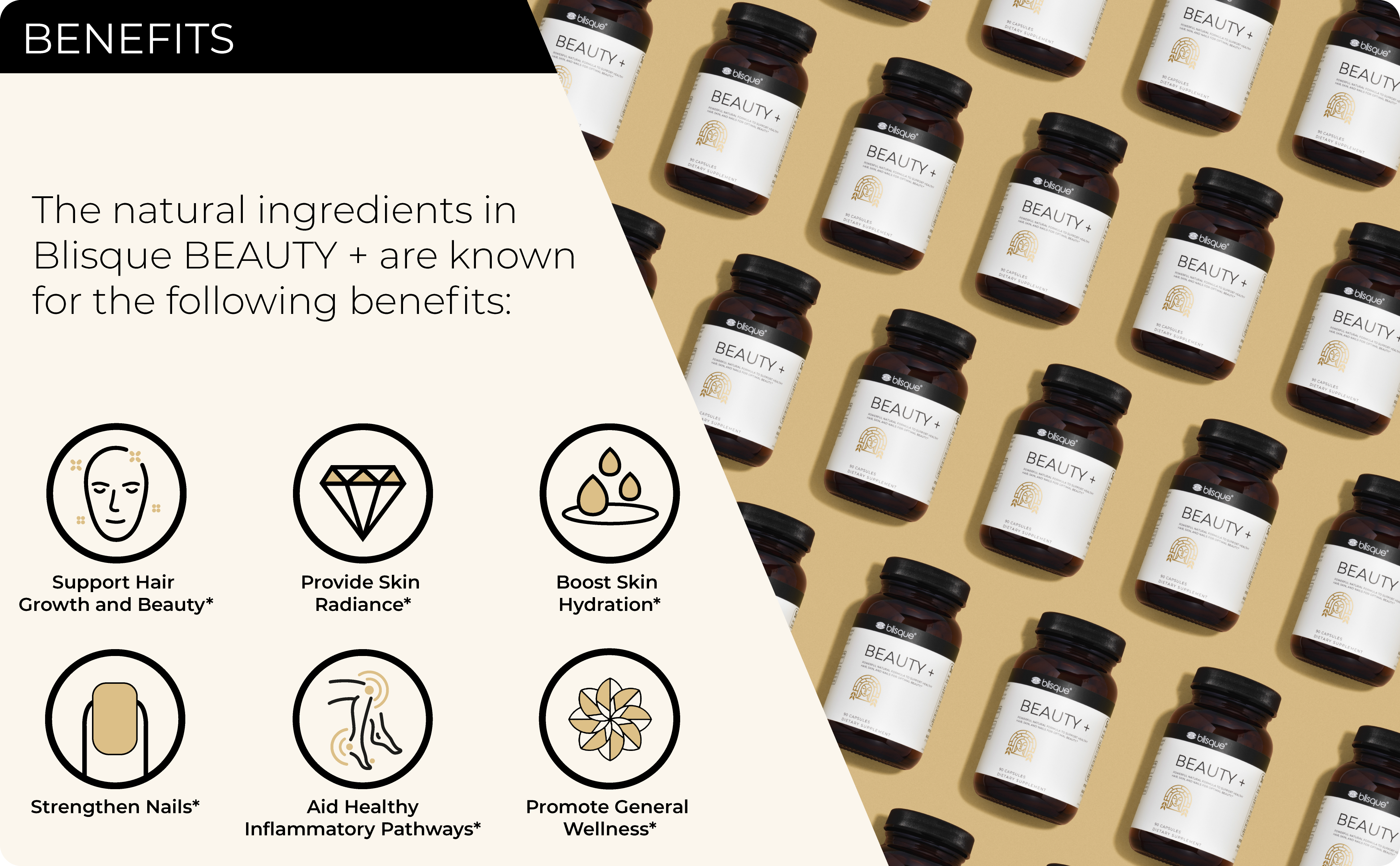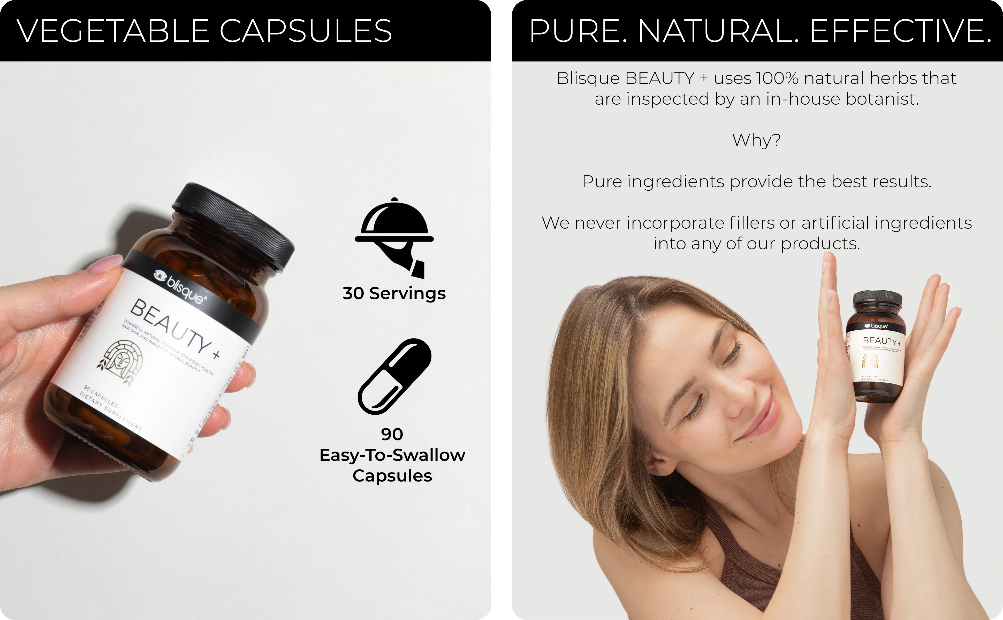 PREMIUM QUALITY: Blisque BEAUTY + uses only genuinely natural ingredients that you can feel good about. It's manufactured in the USA in a state-of-the-art certified cGMP NSF facility. We AVOID fillers and harmful components, including animal by-products, artificial colors, artificial preservatives, artificial sweeteners, corn, gluten, magnesium stearate, parabens, soy, silicon dioxide, and wheat. Why? Because your well-being is our priority.