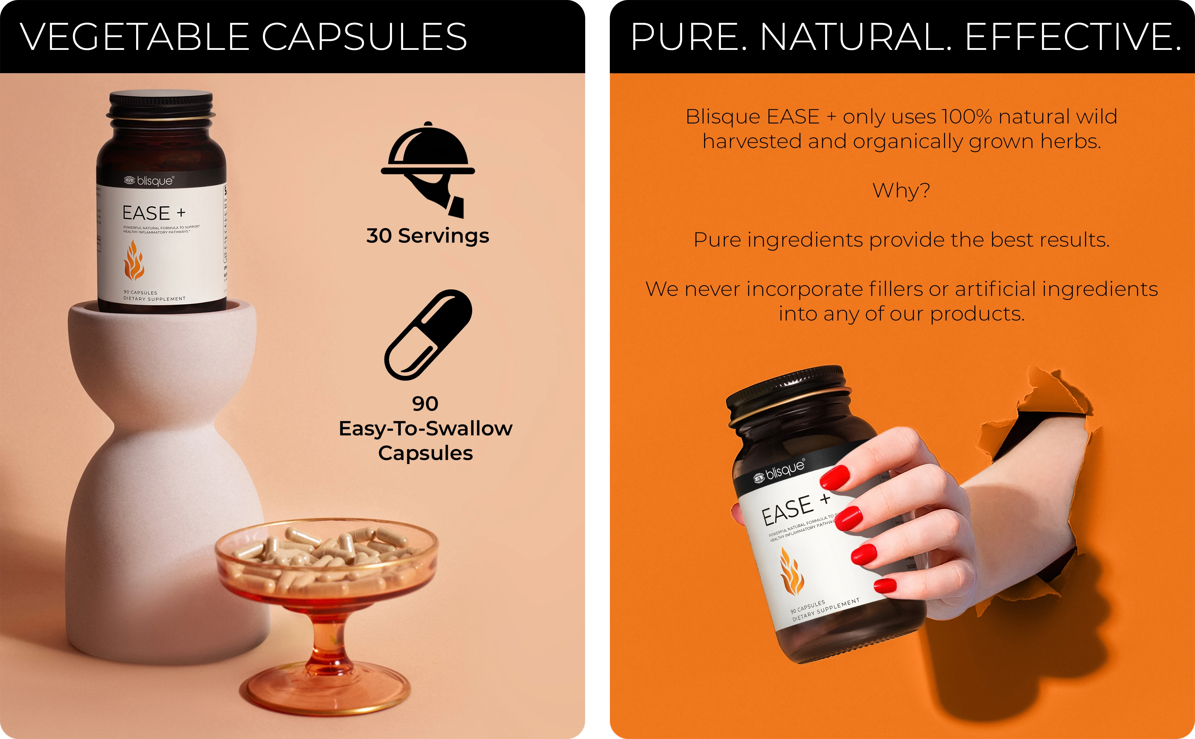 PREMIUM QUALITY: Blisque EASE + uses only genuinely natural ingredients that you can feel good about. It's manufactured in the USA in a state-of-the-art certified cGMP NSF facility. We AVOID fillers and harmful components, including animal by-products, artificial colors, artificial preservatives, artificial sweeteners, corn, gluten, magnesium stearate, parabens, soy, silicon dioxide, and wheat. Why? Because your well-being is our priority.