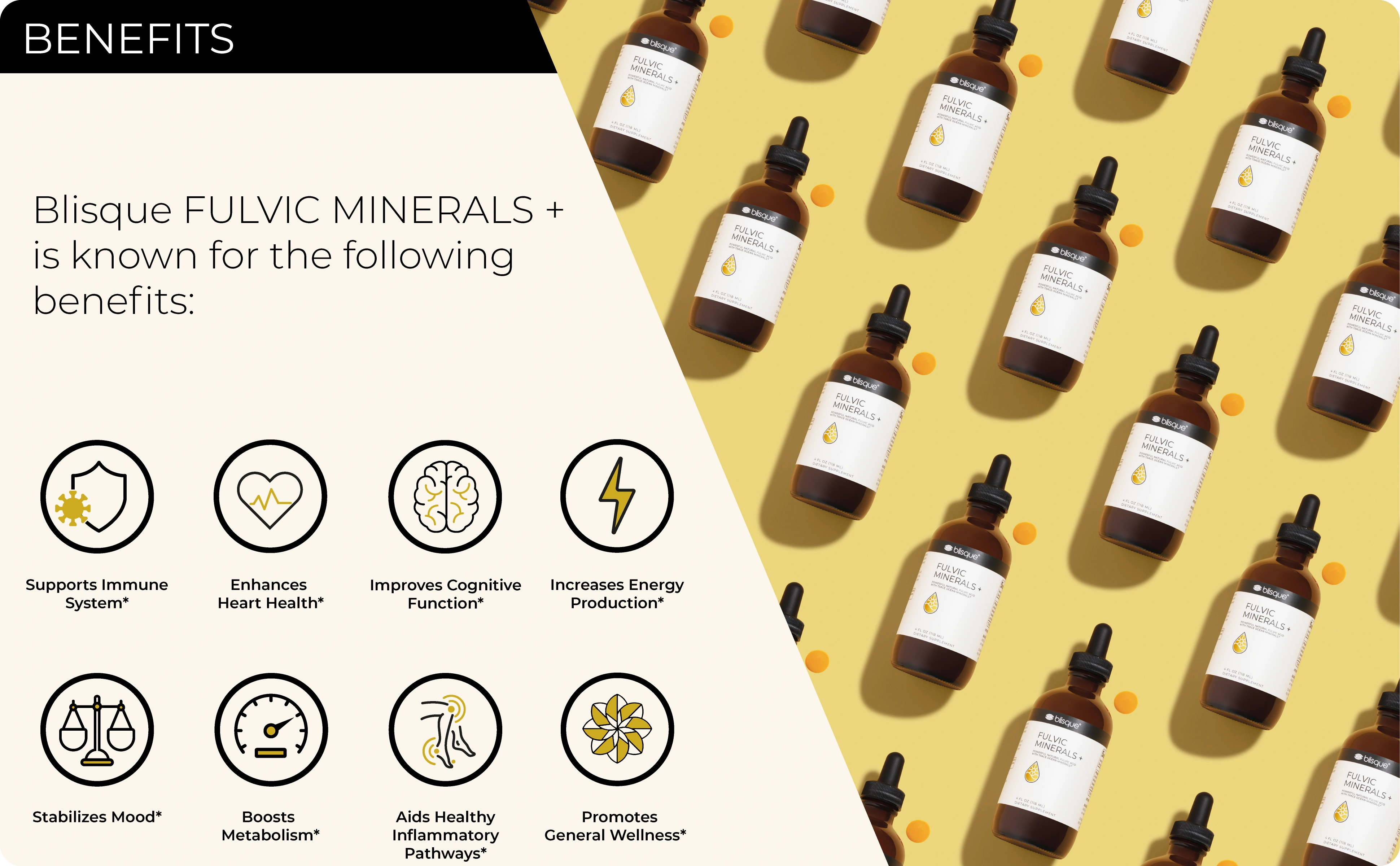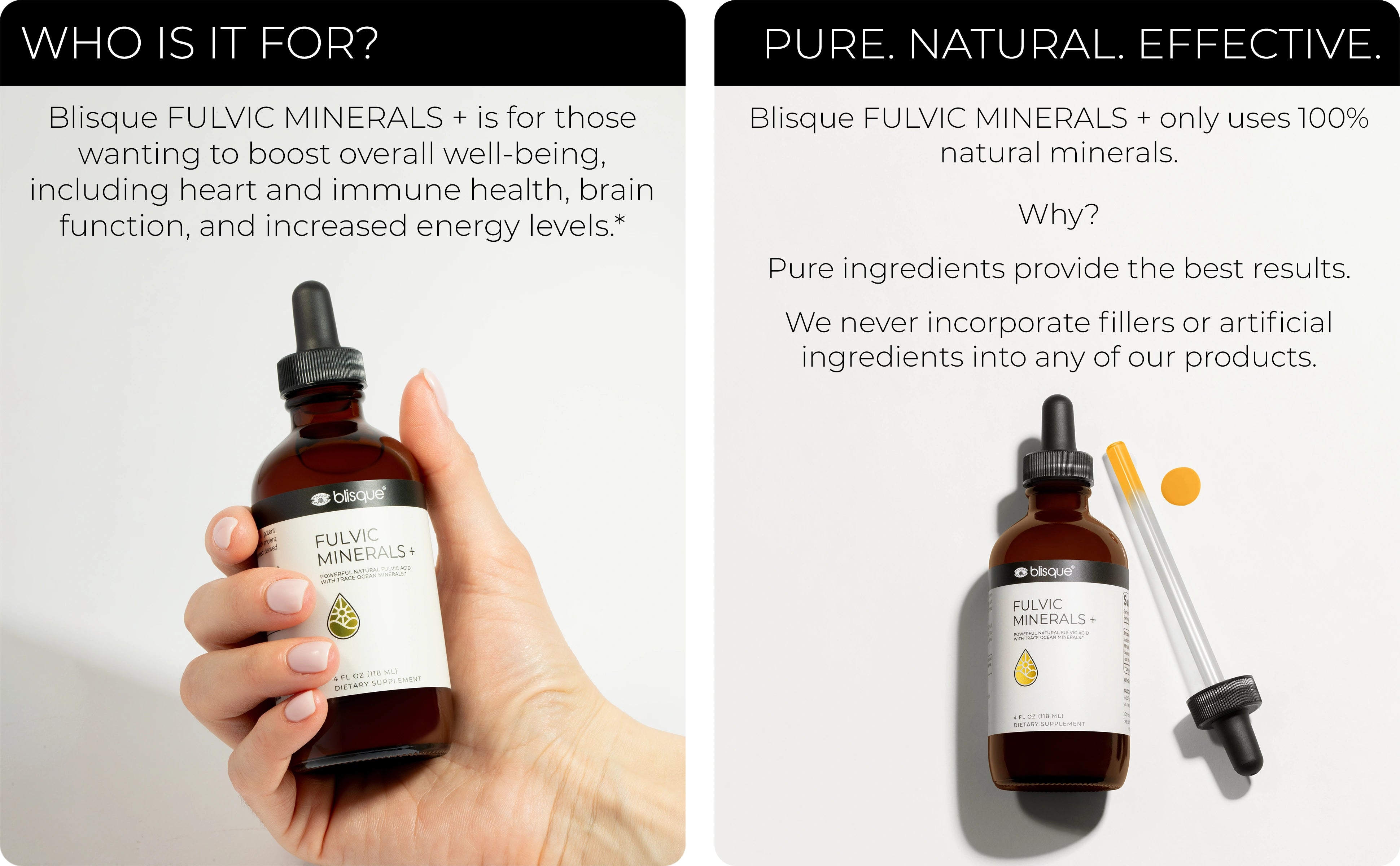 PROMOTE OVERALL WELL-BEING: Blisque FULVIC MINERALS + is a comprehensive mineral supplement that enhances your well-being. It will support your immune system, improve heart health, act as a brain booster, enhance stamina and endurance, and elevate your mood.*
