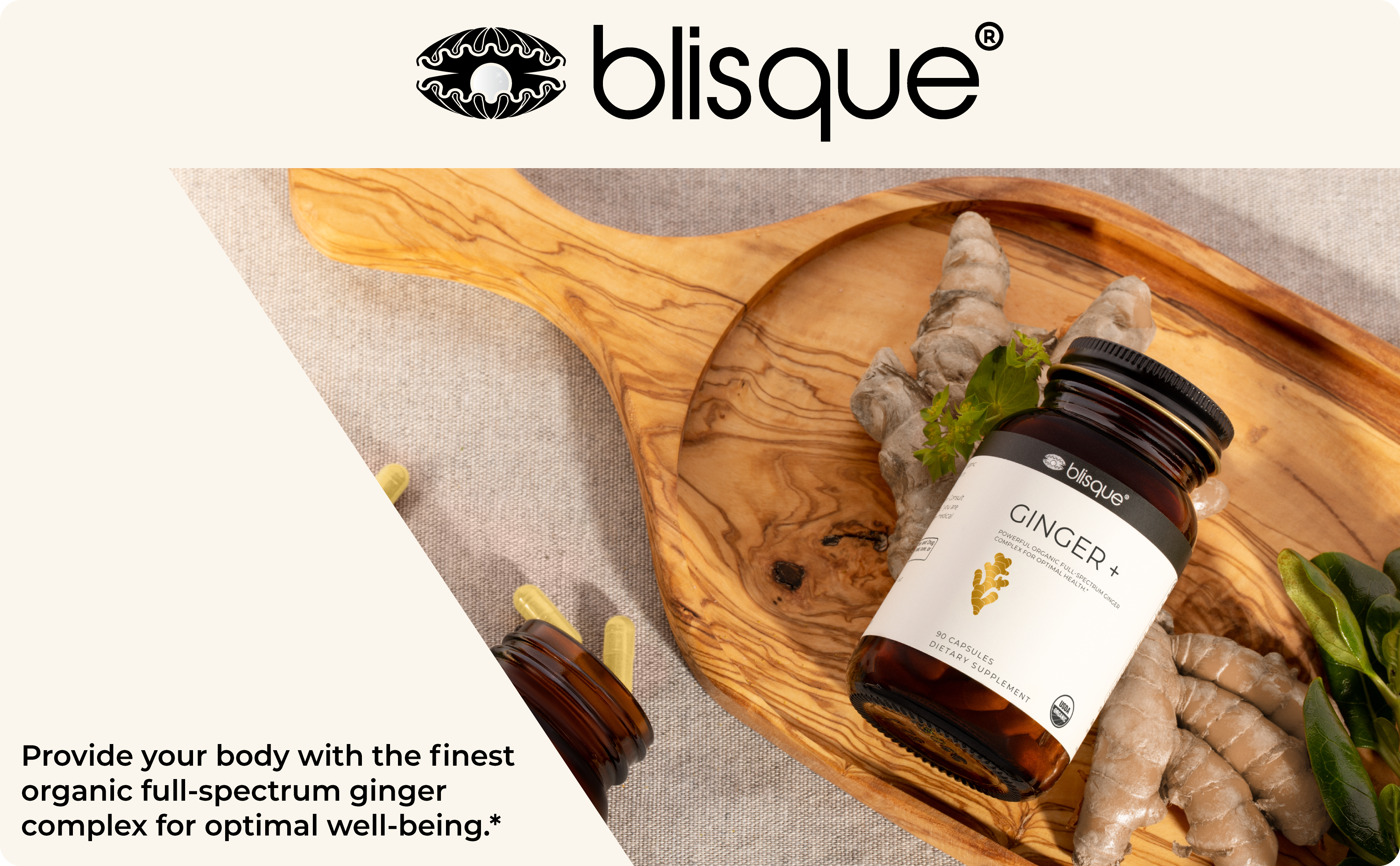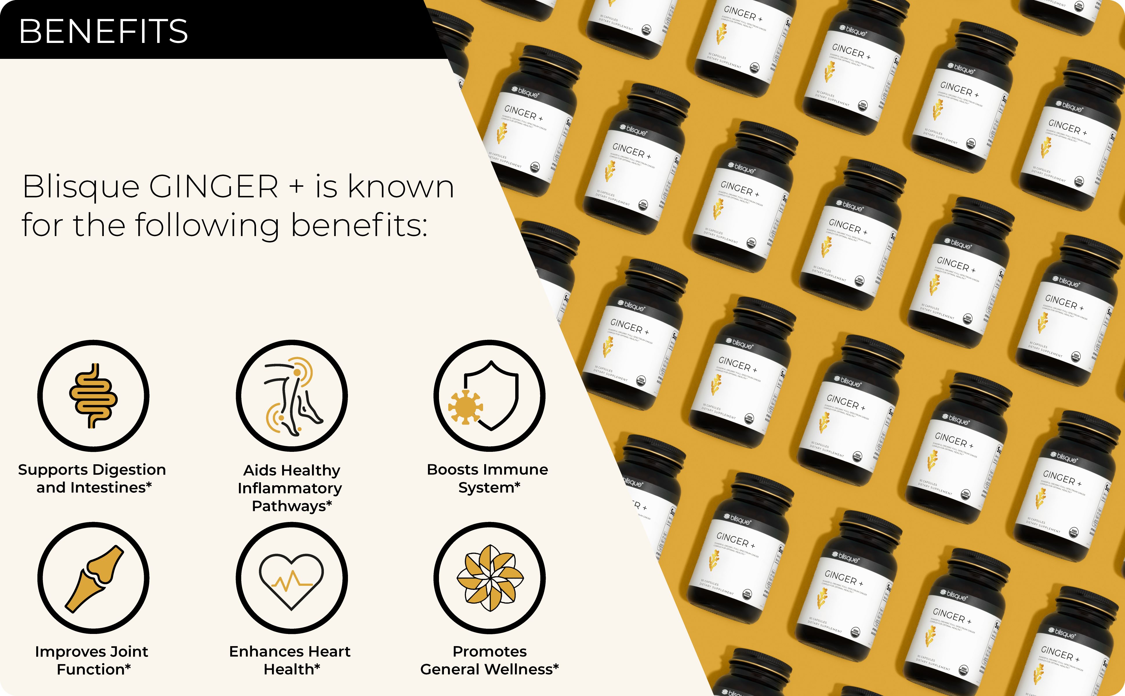 JOINT COMFORT: Blisque GINGER + aids in joint health by relieving daily aches and discomfort, while also enhancing flexibility.*