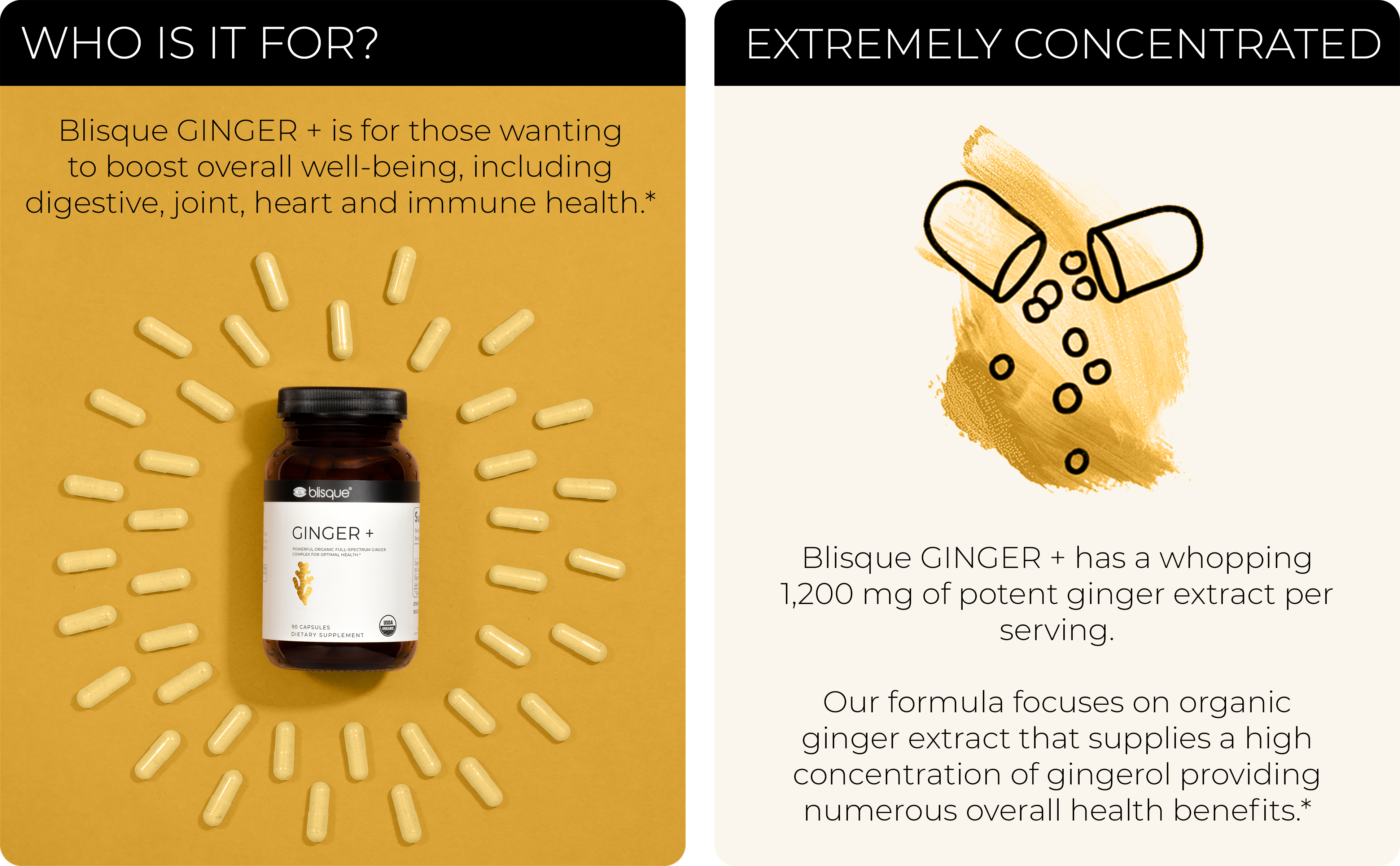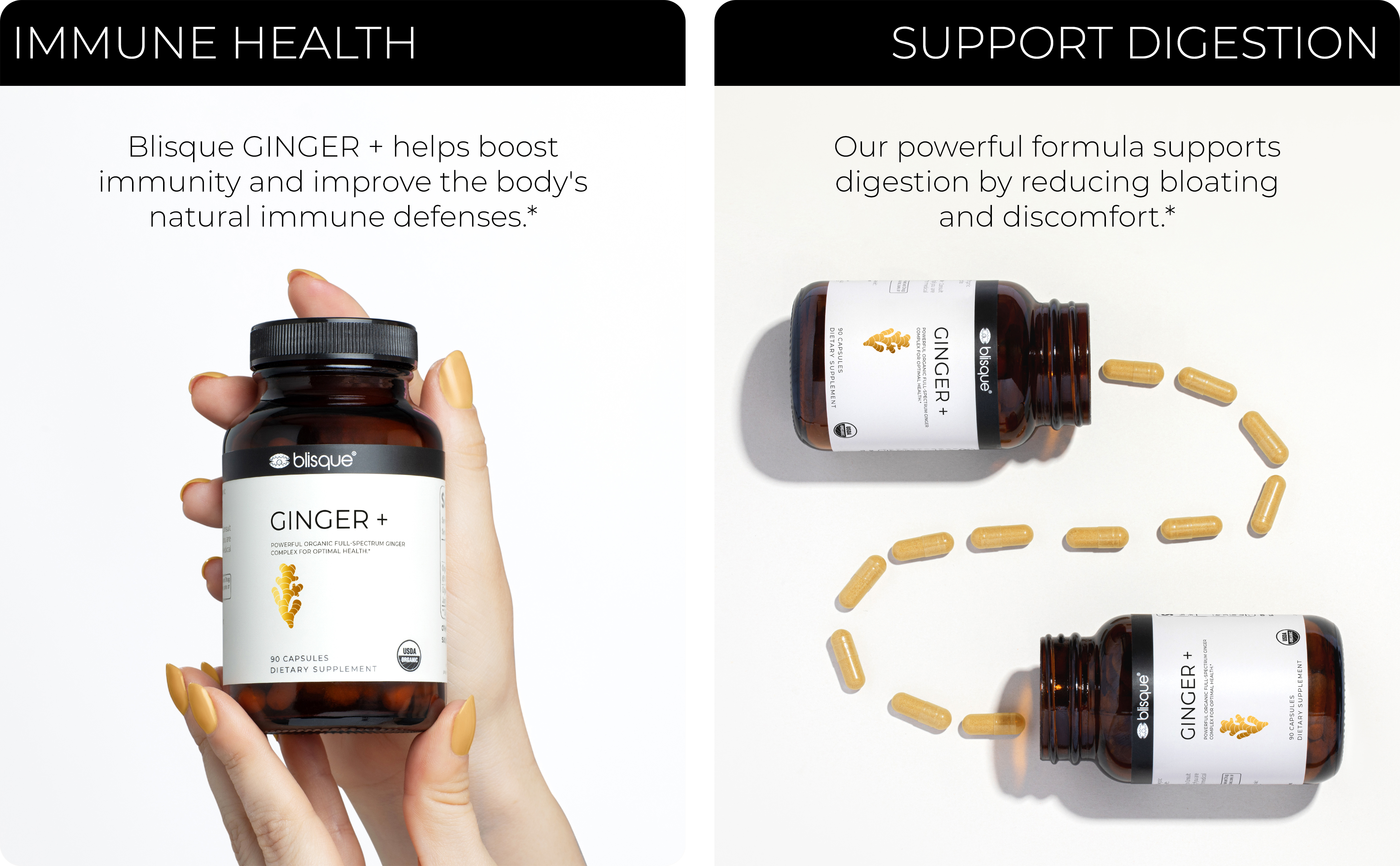 DIGESTIVE HEALTH: Blisque GINGER + promotes a healthier and more soothed digestive system while helping to reduce bloating, gas, and discomfort.*
