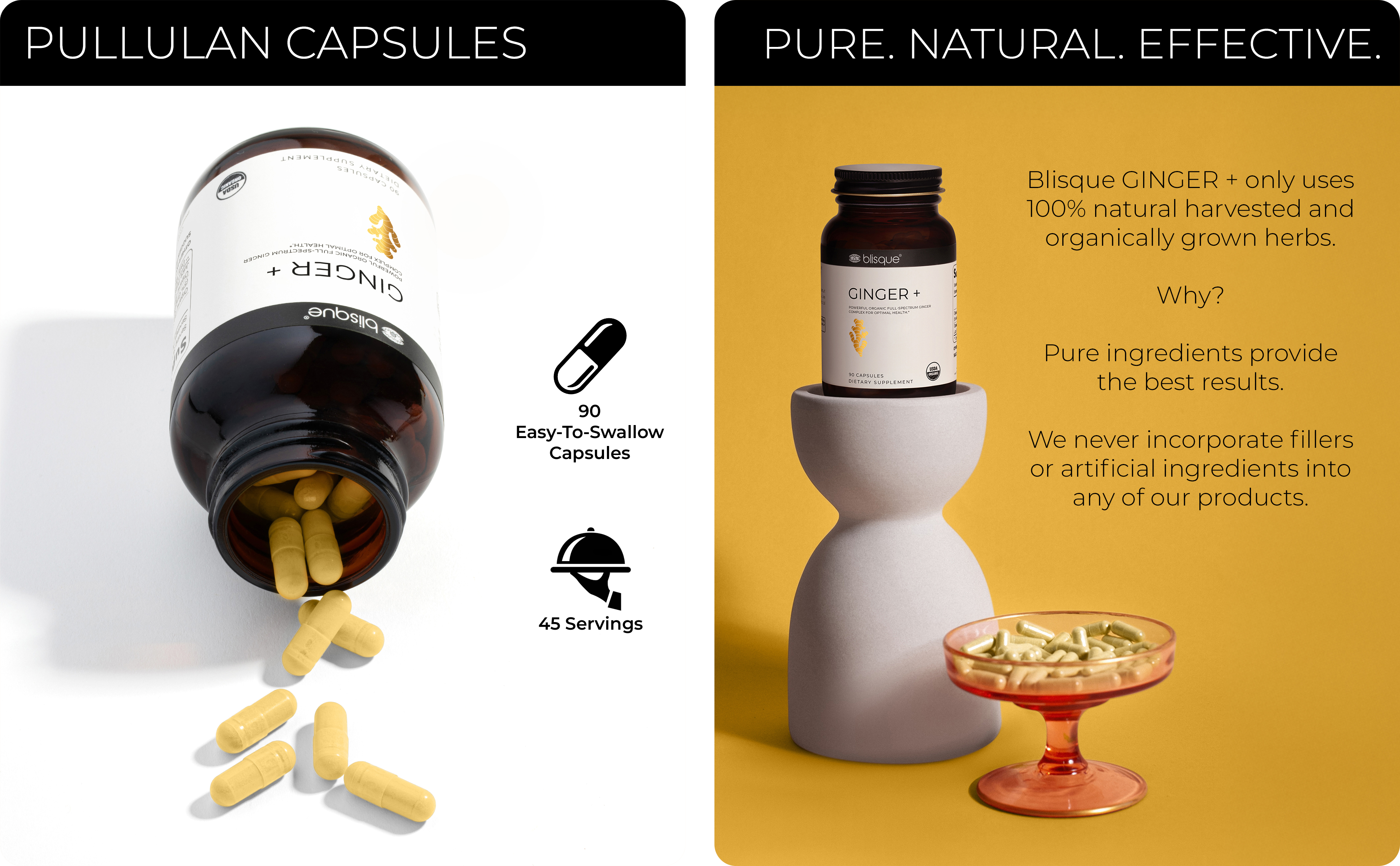 PREMIUM ORGANIC QUALITY: Blisque GINGER + is certified organic and uses only genuinely natural and organic ingredients that you can feel good about. It's manufactured in the USA in a state-of-the-art certified cGMP NSF facility. We AVOID fillers and harmful components, including animal by-products, artificial colors, artificial preservatives, artificial sweeteners, corn, gluten, parabens, soy, and wheat. Why? Because your well-being is our priority.
