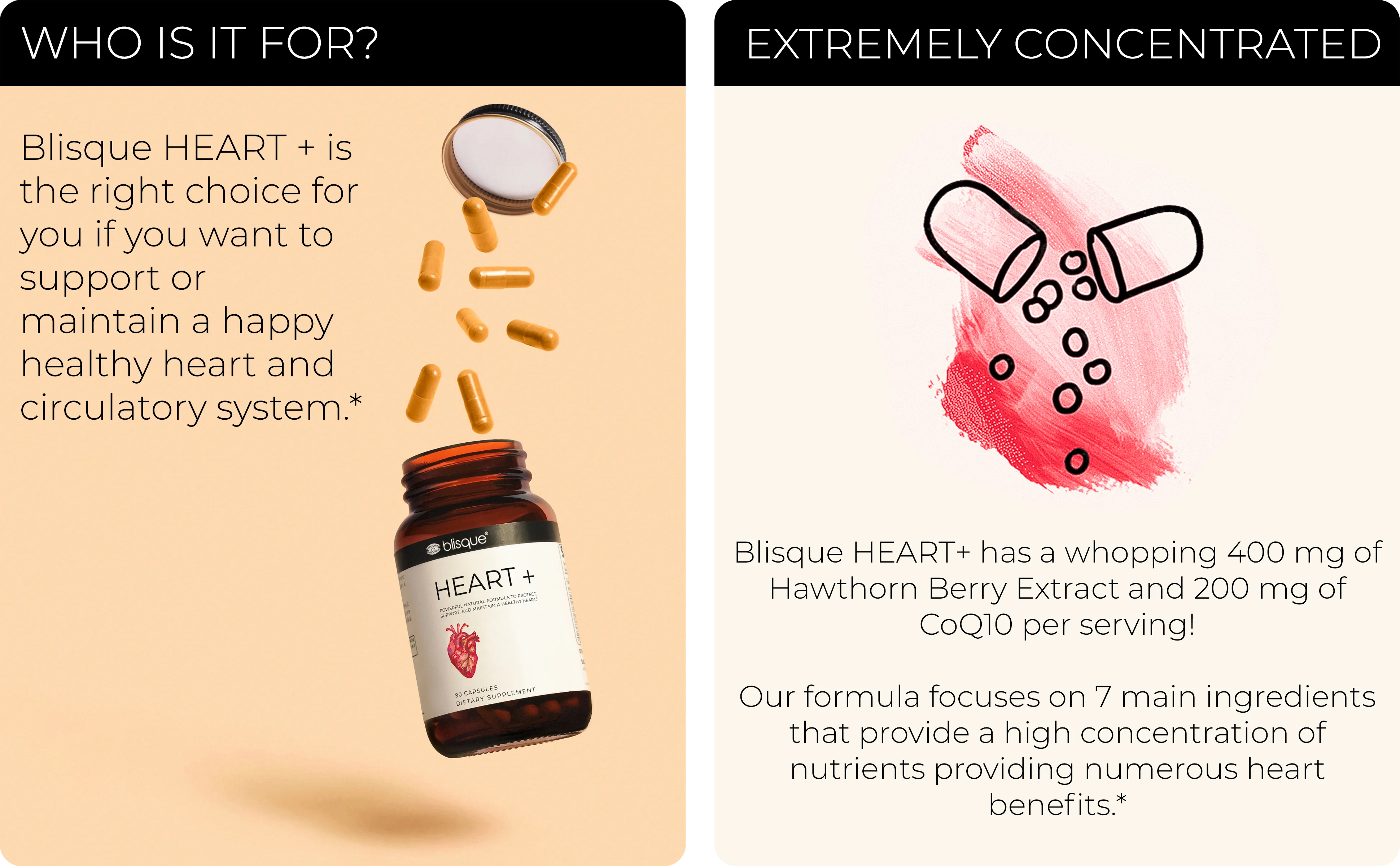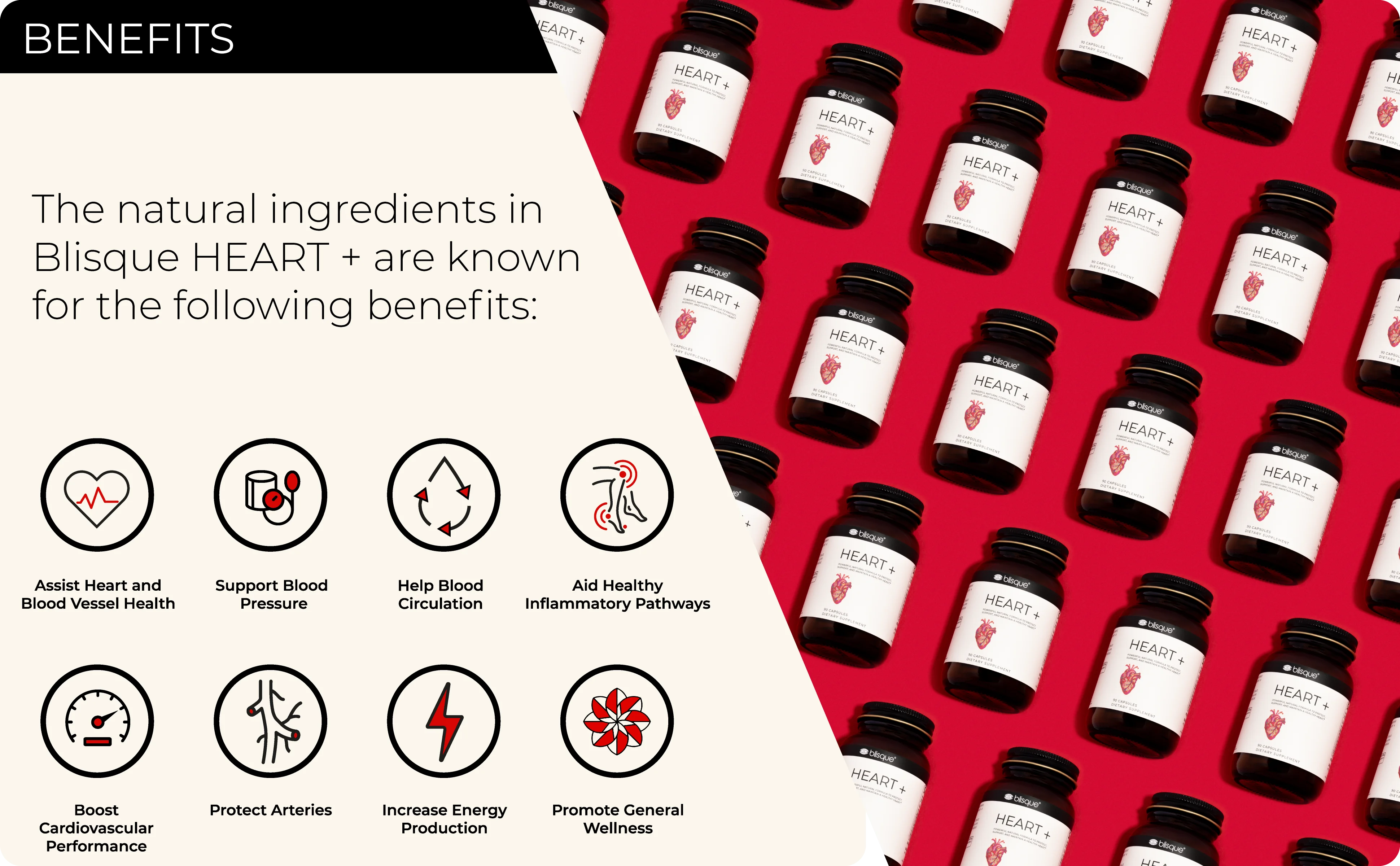 NATURAL HEART SUPPORT: Blisque HEART + delivers premium nutrients to your cardiovascular system, protecting arteries, and offering numerous heart wellness benefits like increased energy, decreased sluggishness, improved heart function, and enhanced vitality.*