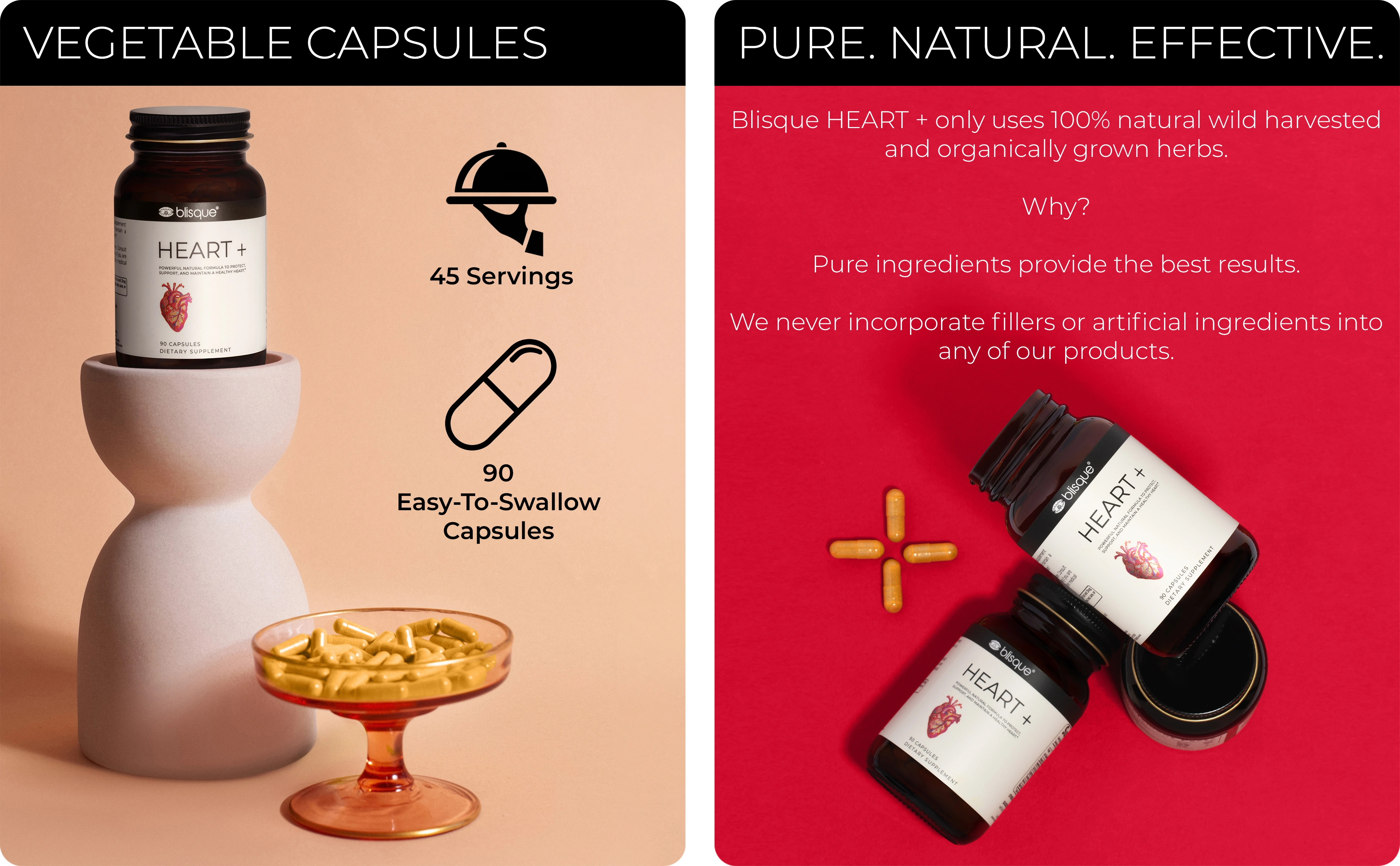 PREMIUM ORGANIC QUALITY: Blisque HEART + uses only genuinely natural and organic ingredients that you can feel good about. It's manufactured in the USA in a state-of-the-art certified cGMP NSF facility. We AVOID fillers and harmful components, including animal by-products, artificial colors, artificial preservatives, artificial sweeteners, corn, gluten, magnesium stearate, parabens, soy, silicon dioxide, and wheat. Why? Because your well-being is our priority.