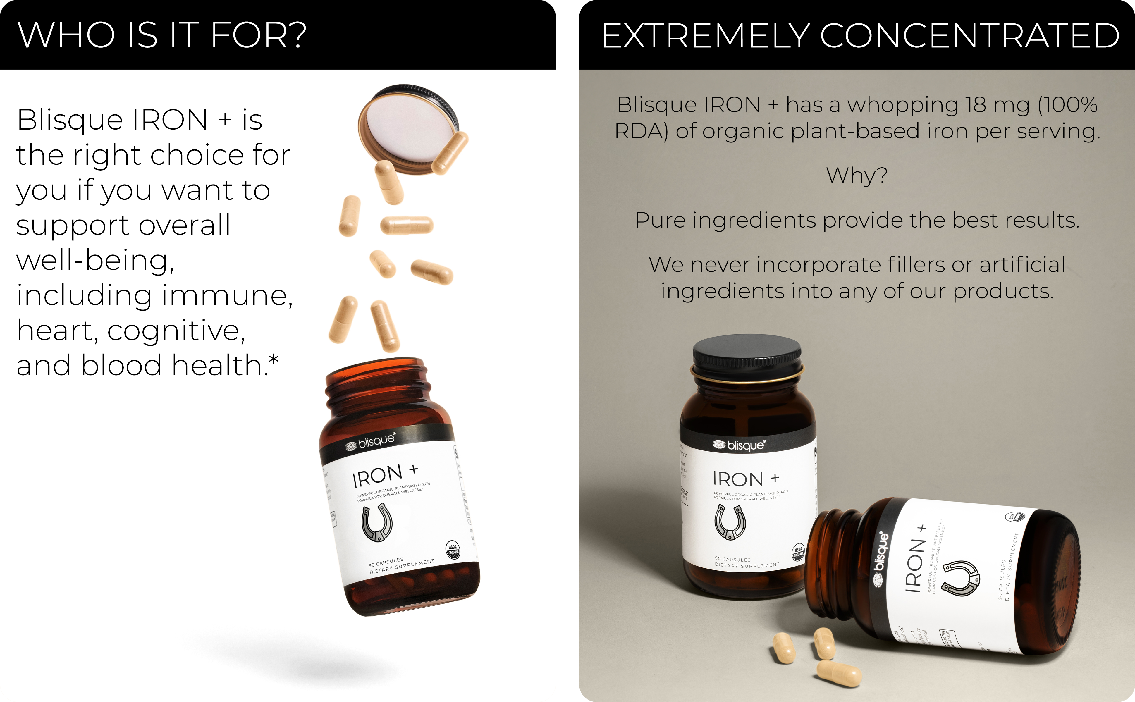 PREMIUM ORGANIC QUALITY: Blisque IRON + is certified organic and uses only genuinely natural and organic ingredients that you can feel good about. It's manufactured in the USA in a state-of-the-art certified cGMP NSF facility. We AVOID fillers and harmful components, including animal by-products, artificial colors, artificial preservatives, artificial sweeteners, corn, gluten, parabens, soy, and wheat. Why? Because your well-being is our priority.
