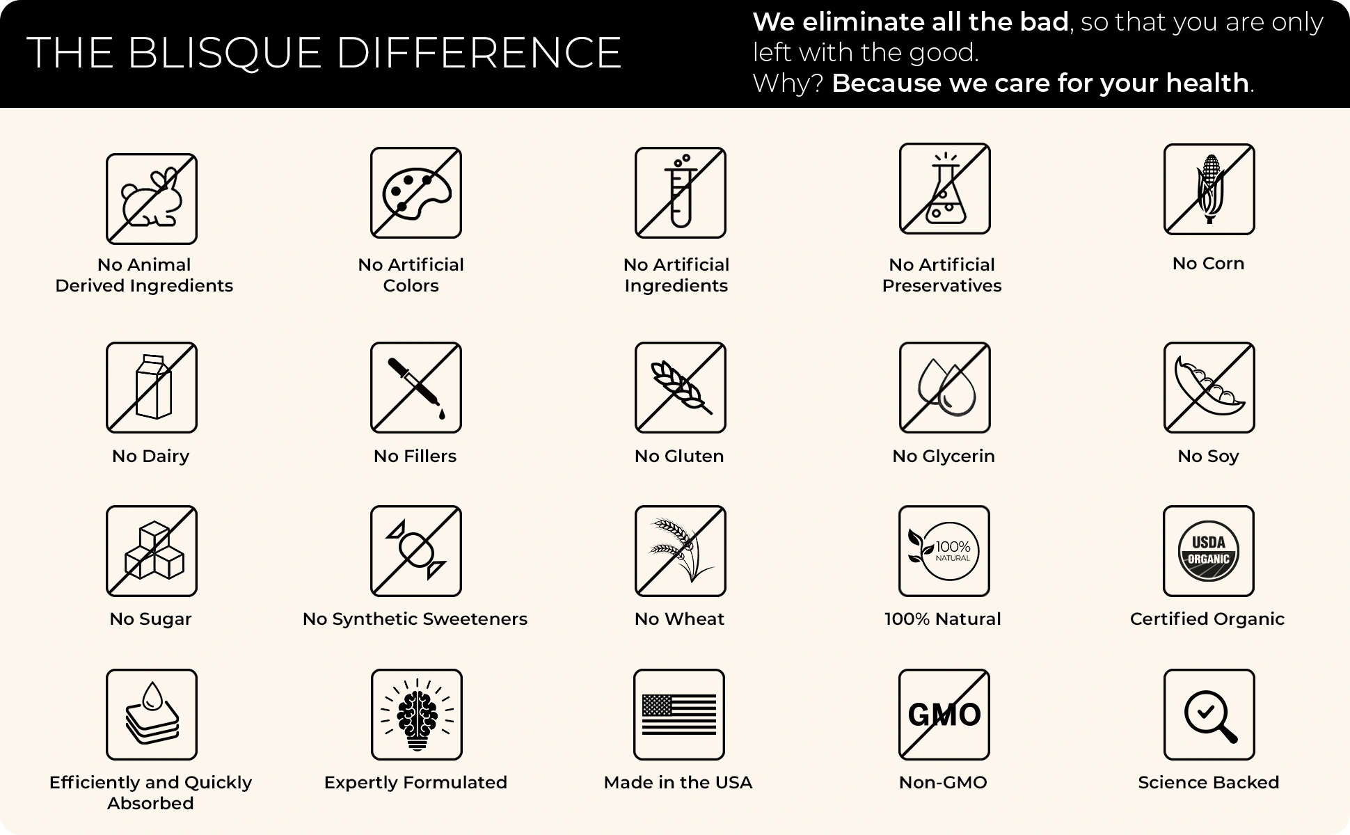 PREMIUM QUALITY: Blisque LIVER + uses only genuinely natural and organic ingredients that you can feel good about. It's manufactured in the USA in a state-of-the-art certified cGMP NSF facility. We AVOID fillers and harmful components, including animal by-products, artificial colors, artificial preservatives, artificial sweeteners, corn, gluten, magnesium stearate, parabens, soy, silicon dioxide, and wheat. Why? Because your well-being is our priority.