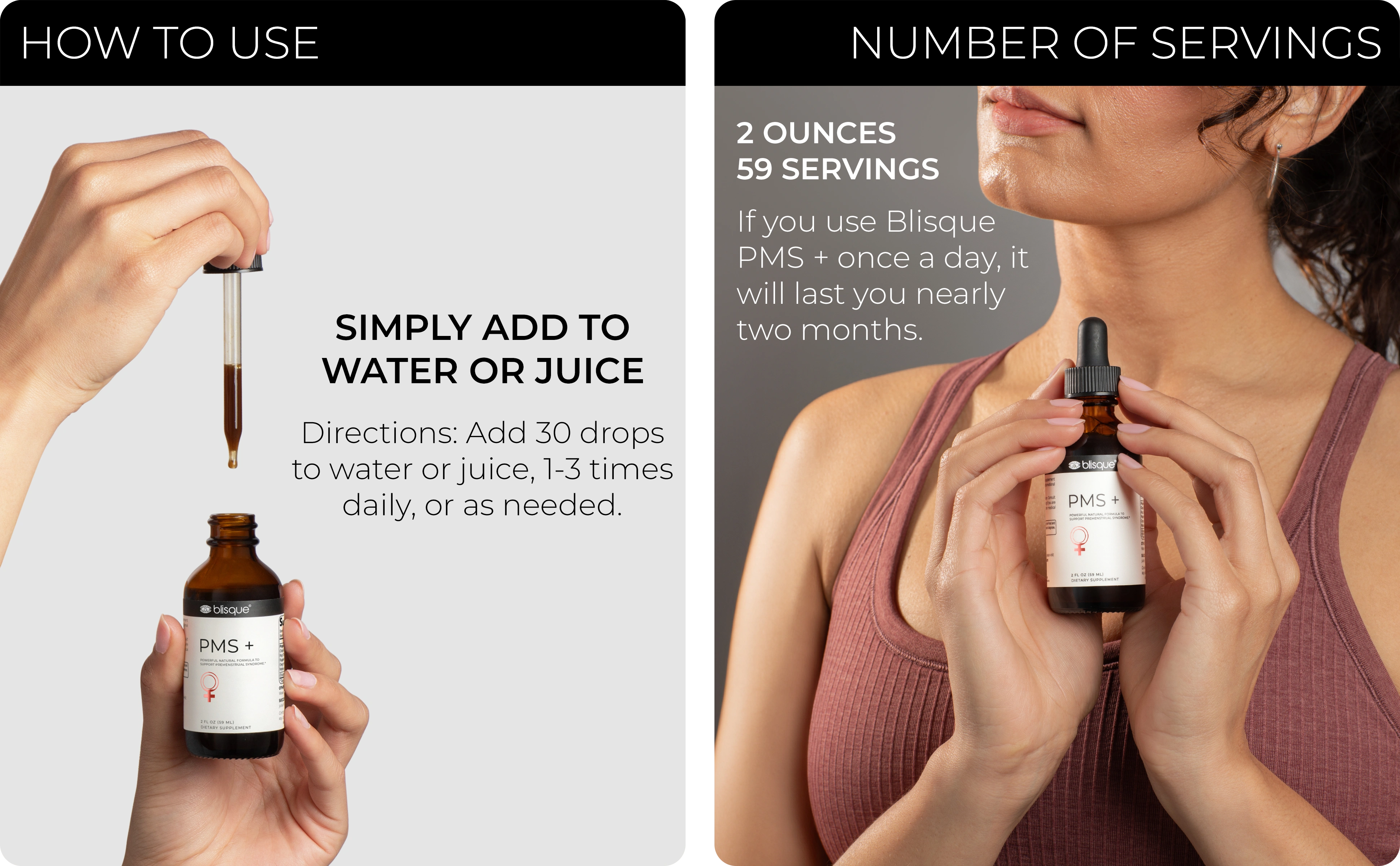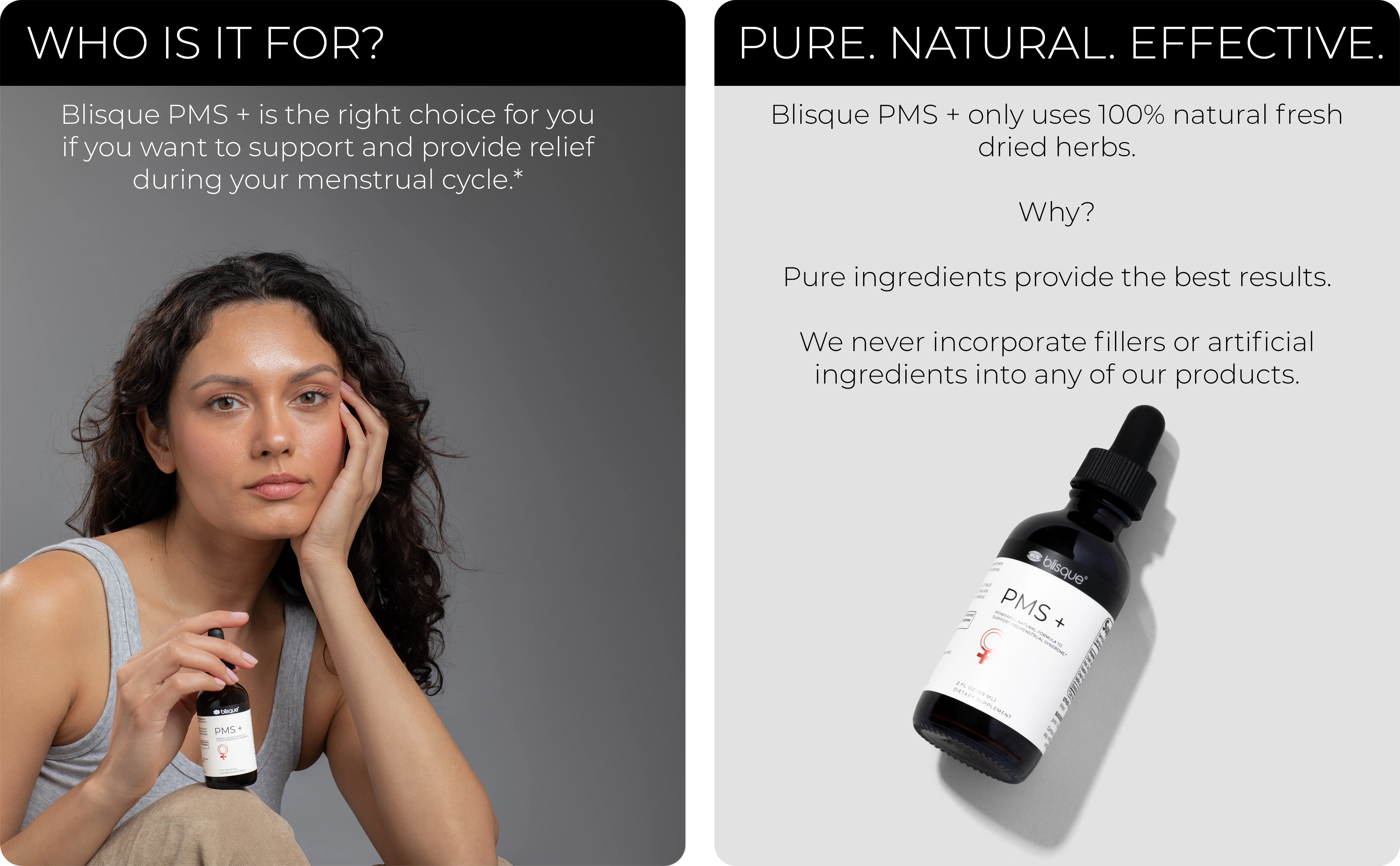 INGREDIENTS THAT PROVIDE CLINICAL LEVEL SUPPORT: Blisque PMS + is expertly formulated with certified natural herbs, including chaste tree, wild yam, dong quai, red raspberry, licorice, oregon grape, cramp bark, nettle, and fresh garrya. This combination of science-backed ingredients creates a powerful synergy that provides the finest premenstrual support you can get, just as Mother Nature intended.*