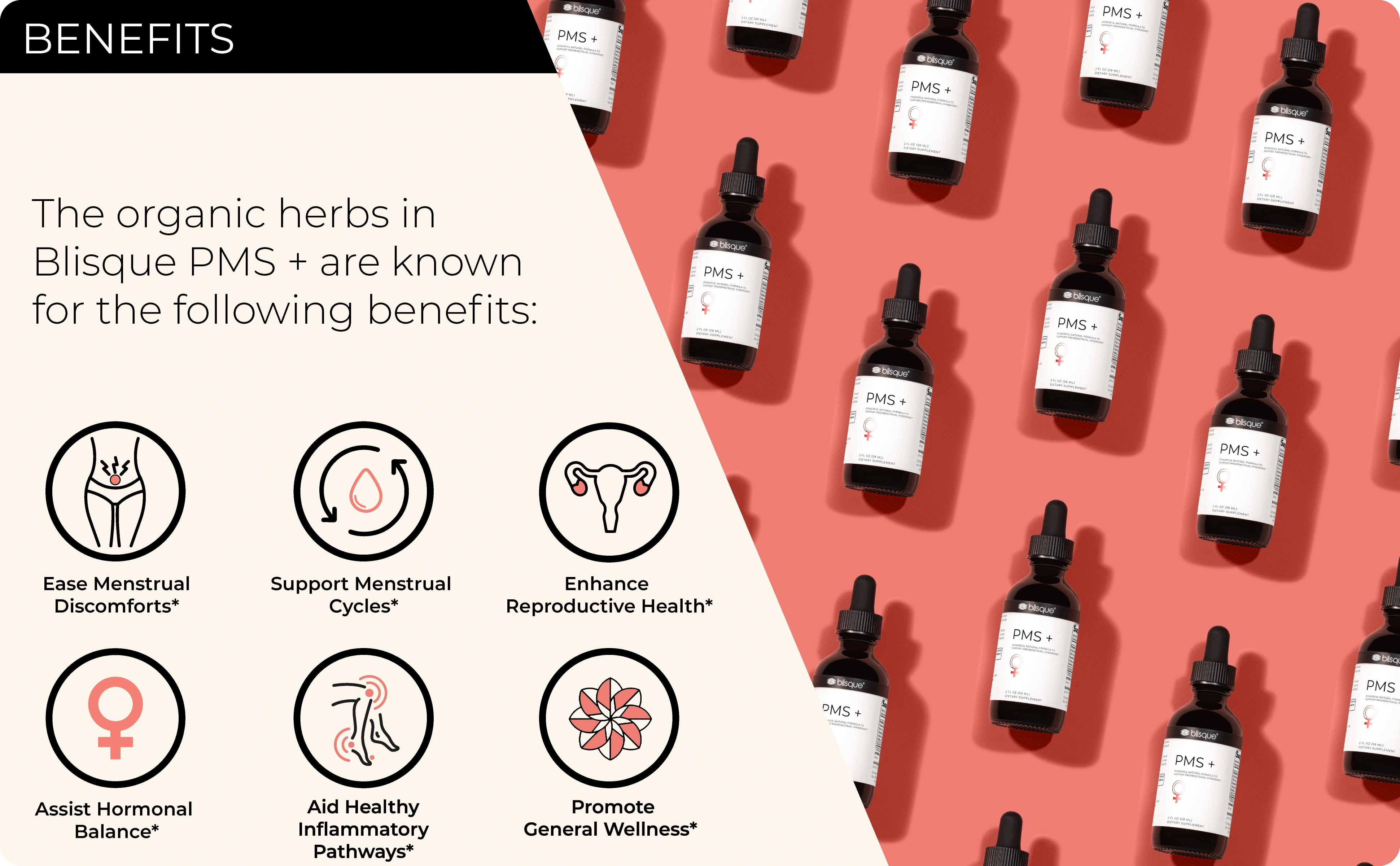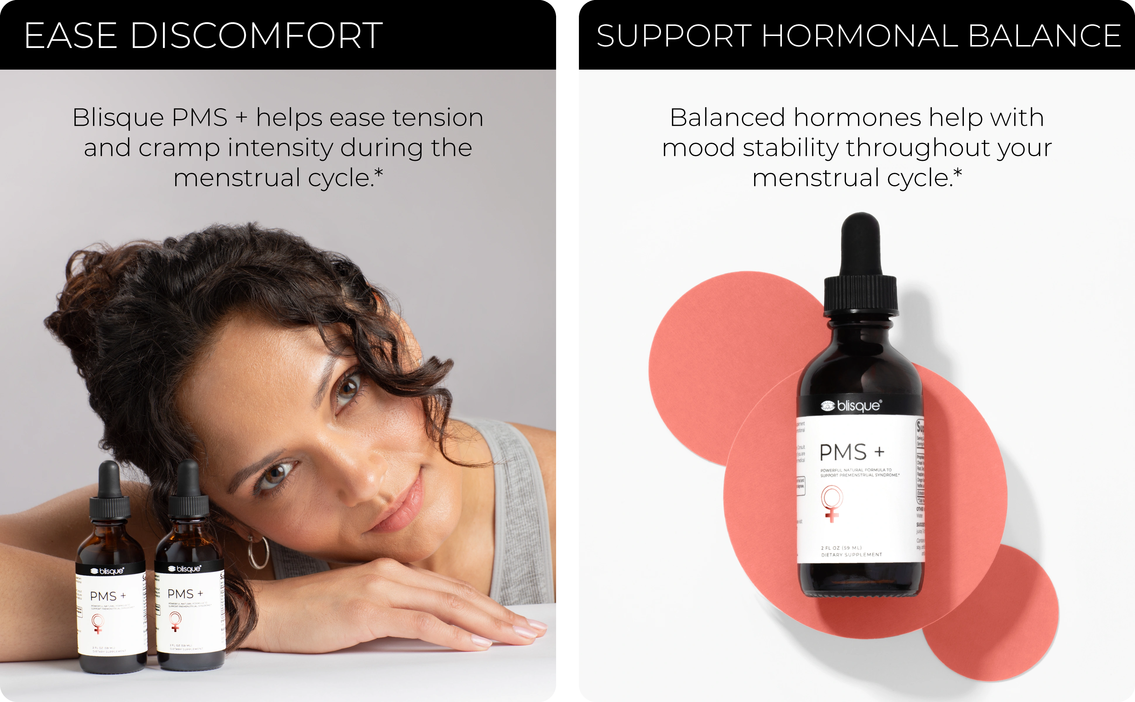 HORMONAL BALANCE: Blisque PMS + contains natural ingredients to support hormone balance for women, promoting an optimal menstrual cycle.*