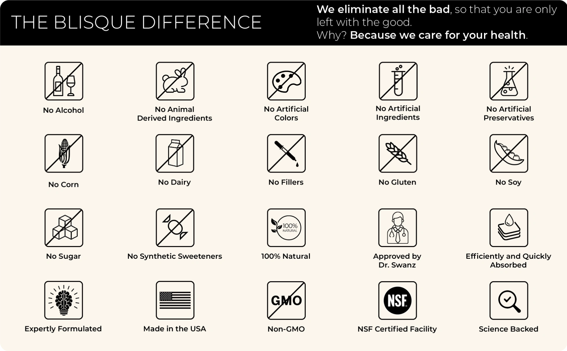 AUTHENTIC AND NATURAL: Blisque PMS + uses only genuinely natural ingredients that you can feel good about. It's manufactured in the USA in a state-of-the-art certified cGMP NSF facility. We AVOID fillers and harmful components, including animal by-products, artificial colors, artificial preservatives, artificial sweeteners, corn, gluten, parabens, soy, and wheat. Why? Because your well-being is our priority.