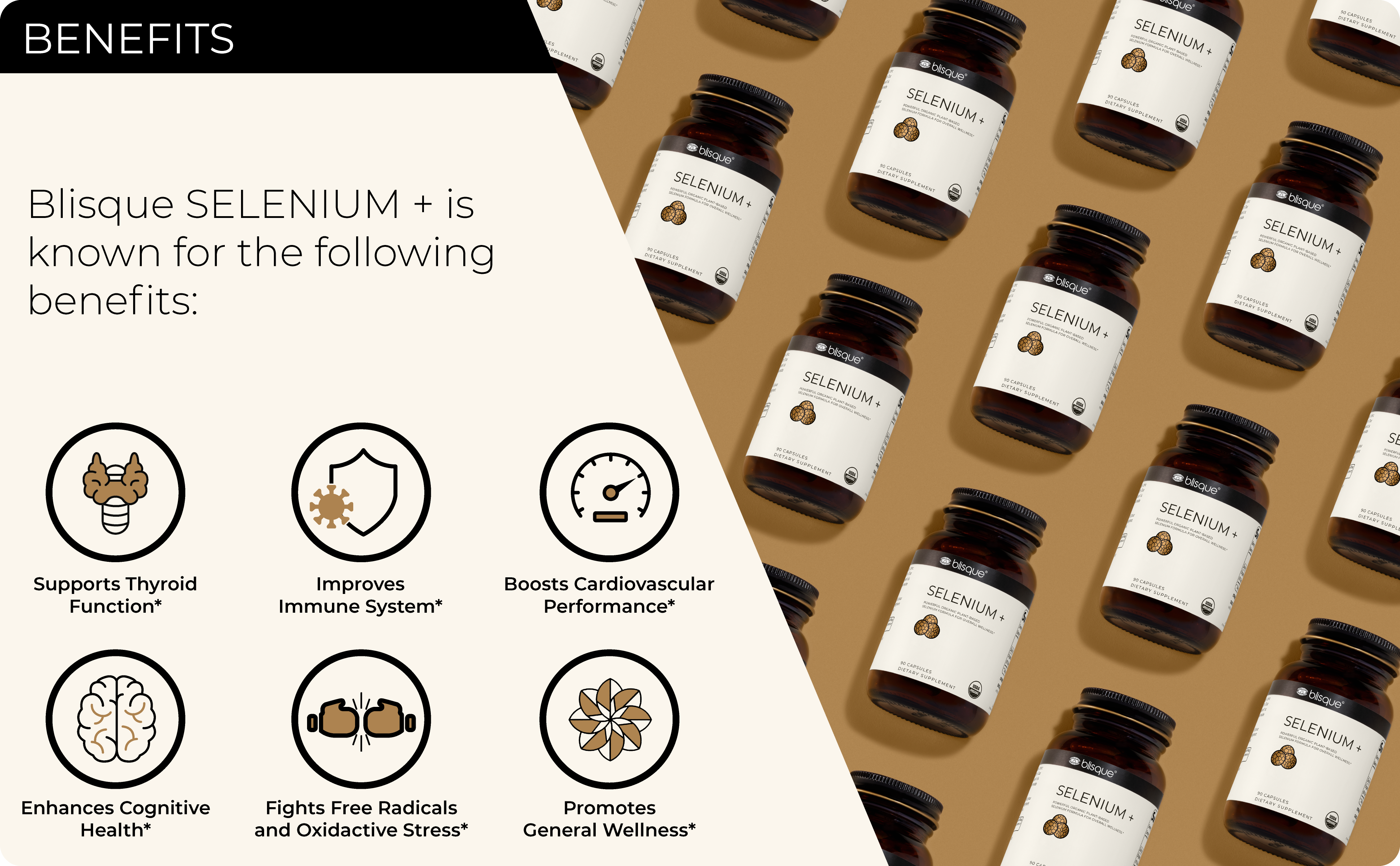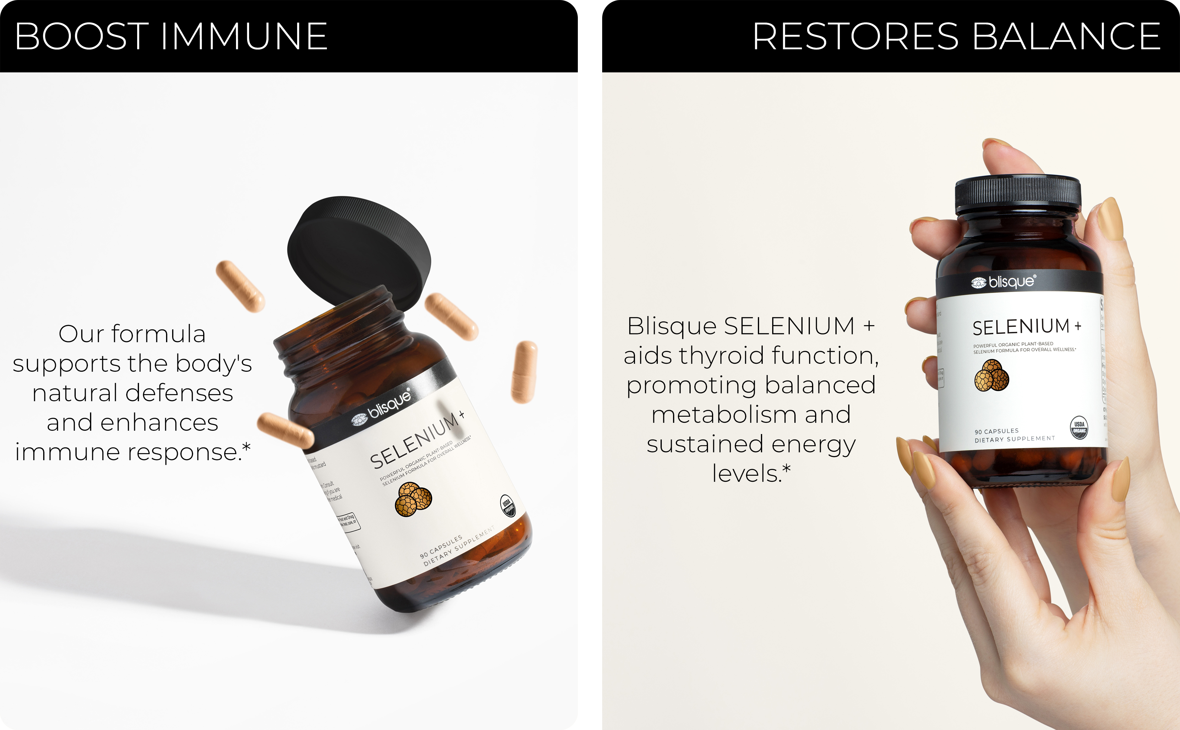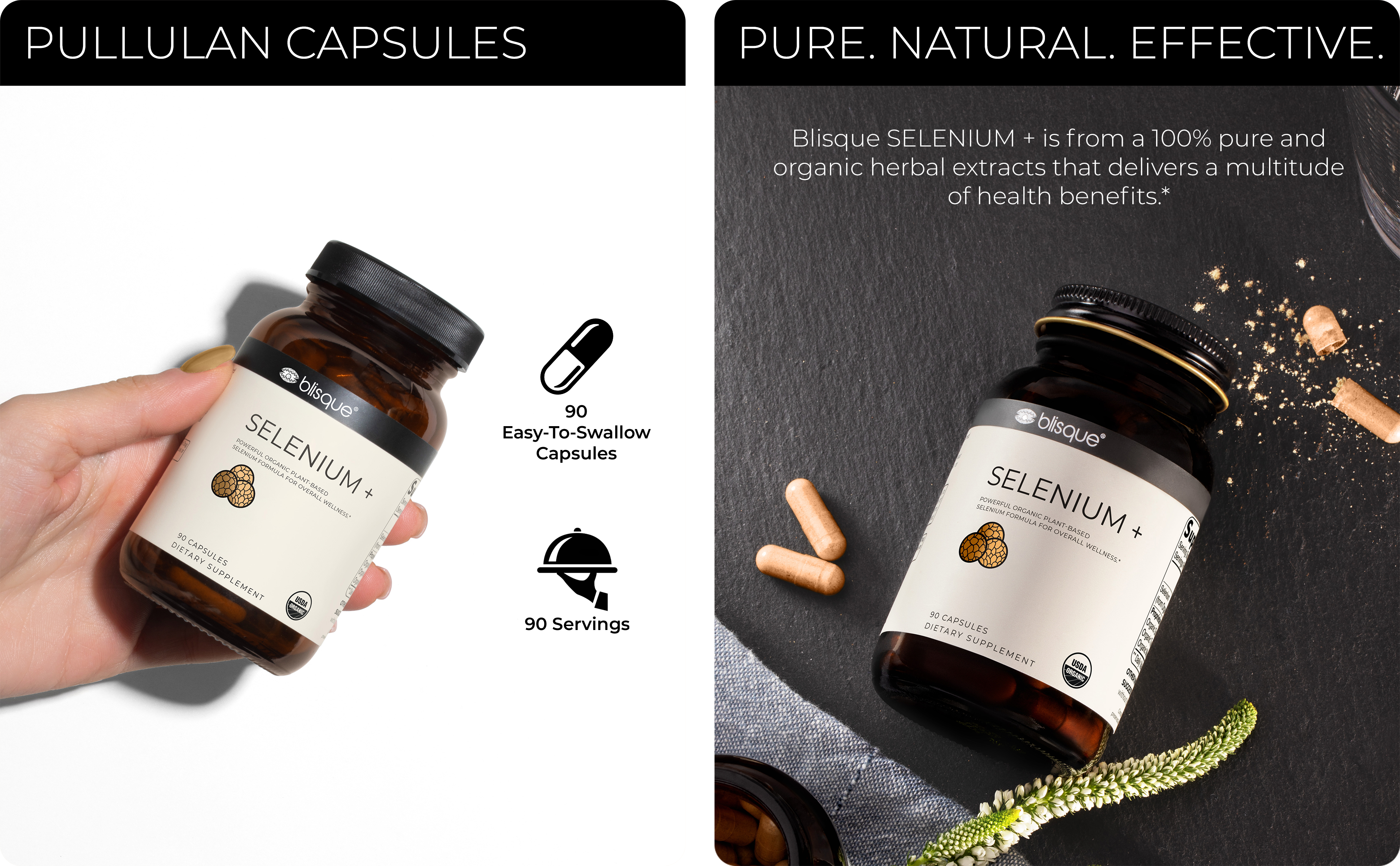 PREMIUM ORGANIC QUALITY: Blisque SELENIUM + uses only certified organic ingredients that you can feel good about. It's manufactured in the USA in a state-of-the-art certified cGMP NSF facility. We AVOID fillers and harmful components, including animal by-products, artificial colors, artificial preservatives, artificial sweeteners, corn, gluten, magnesium stearate, parabens, soy, silicon dioxide, and wheat. Why? Because your well-being is our priority.