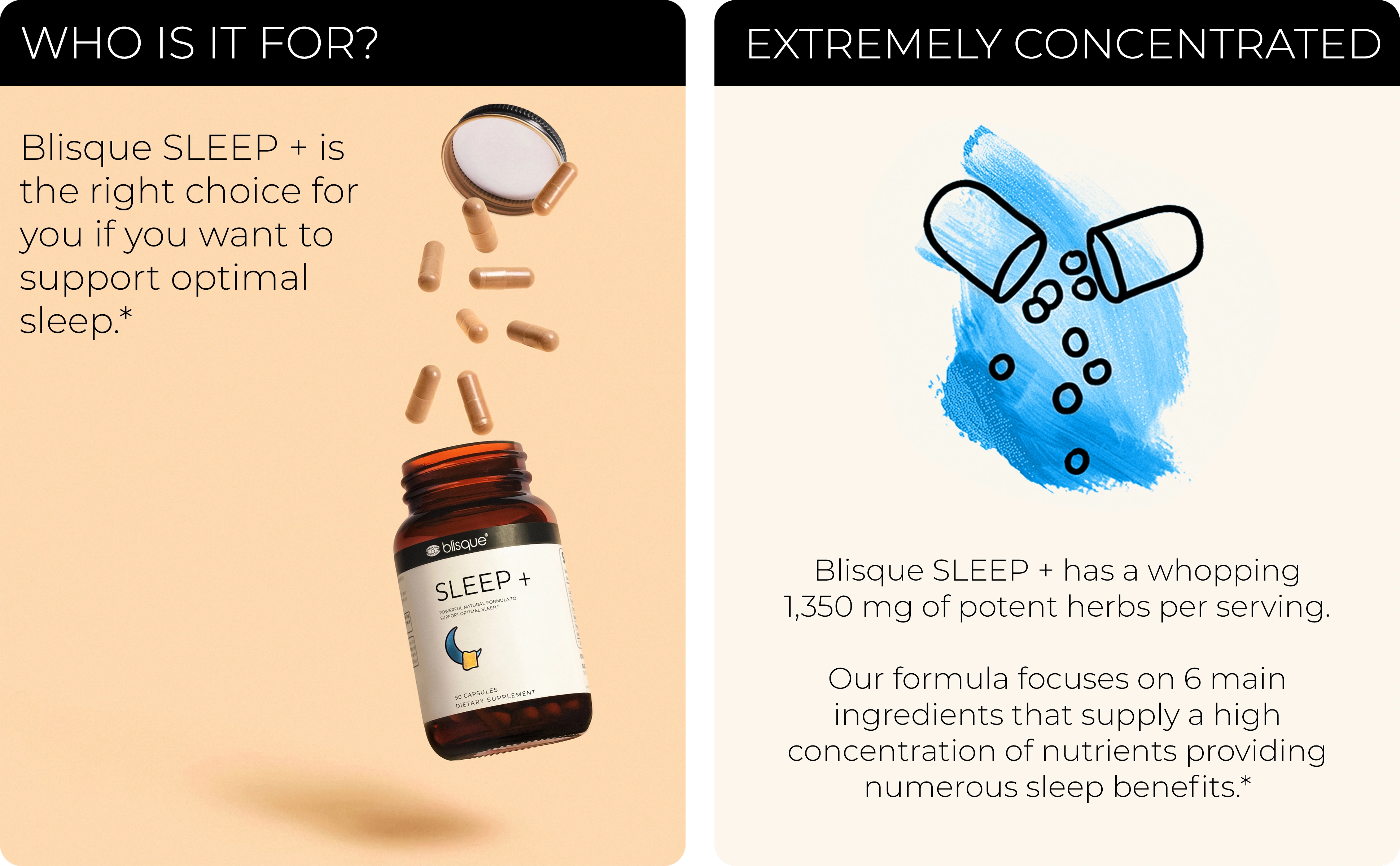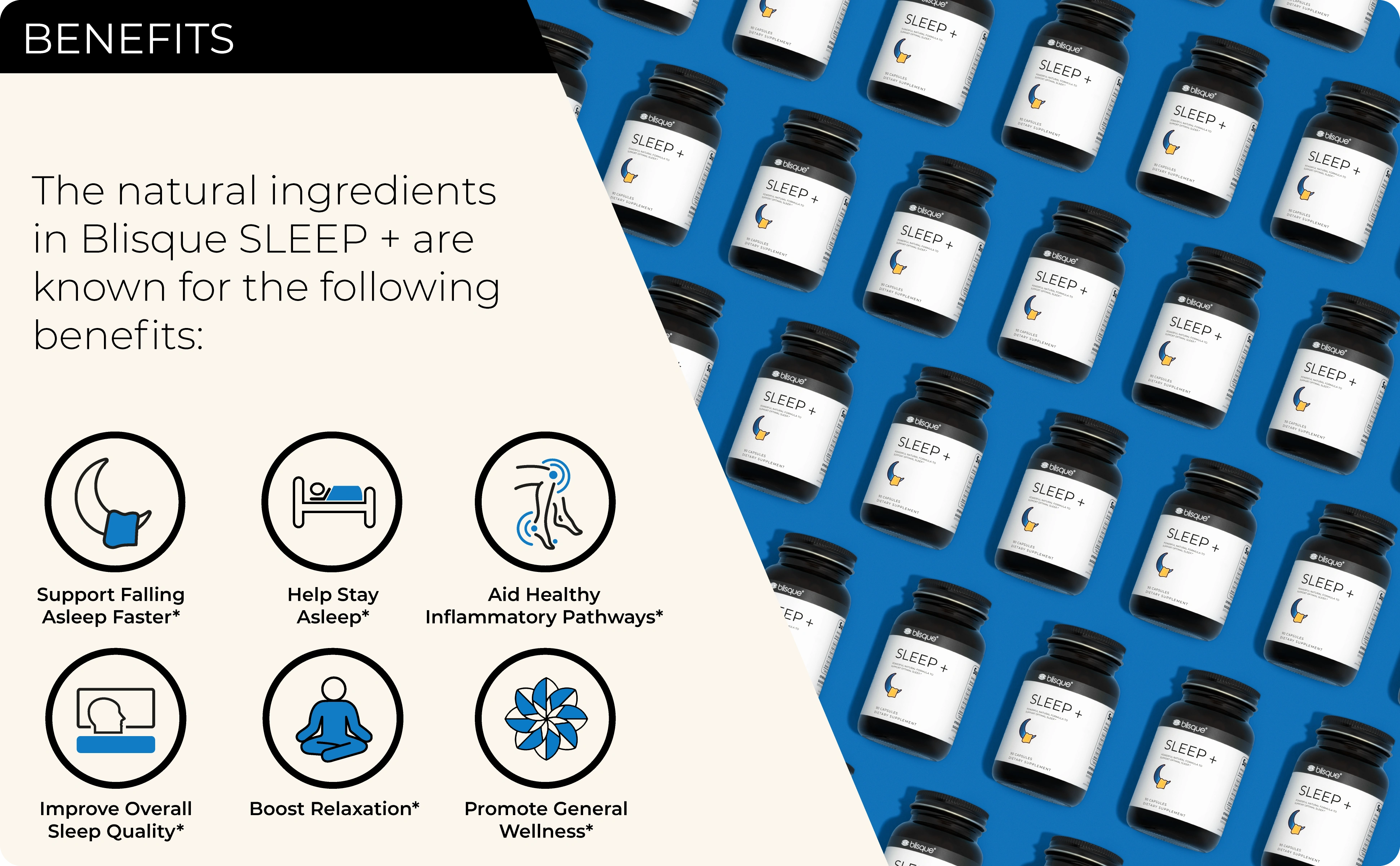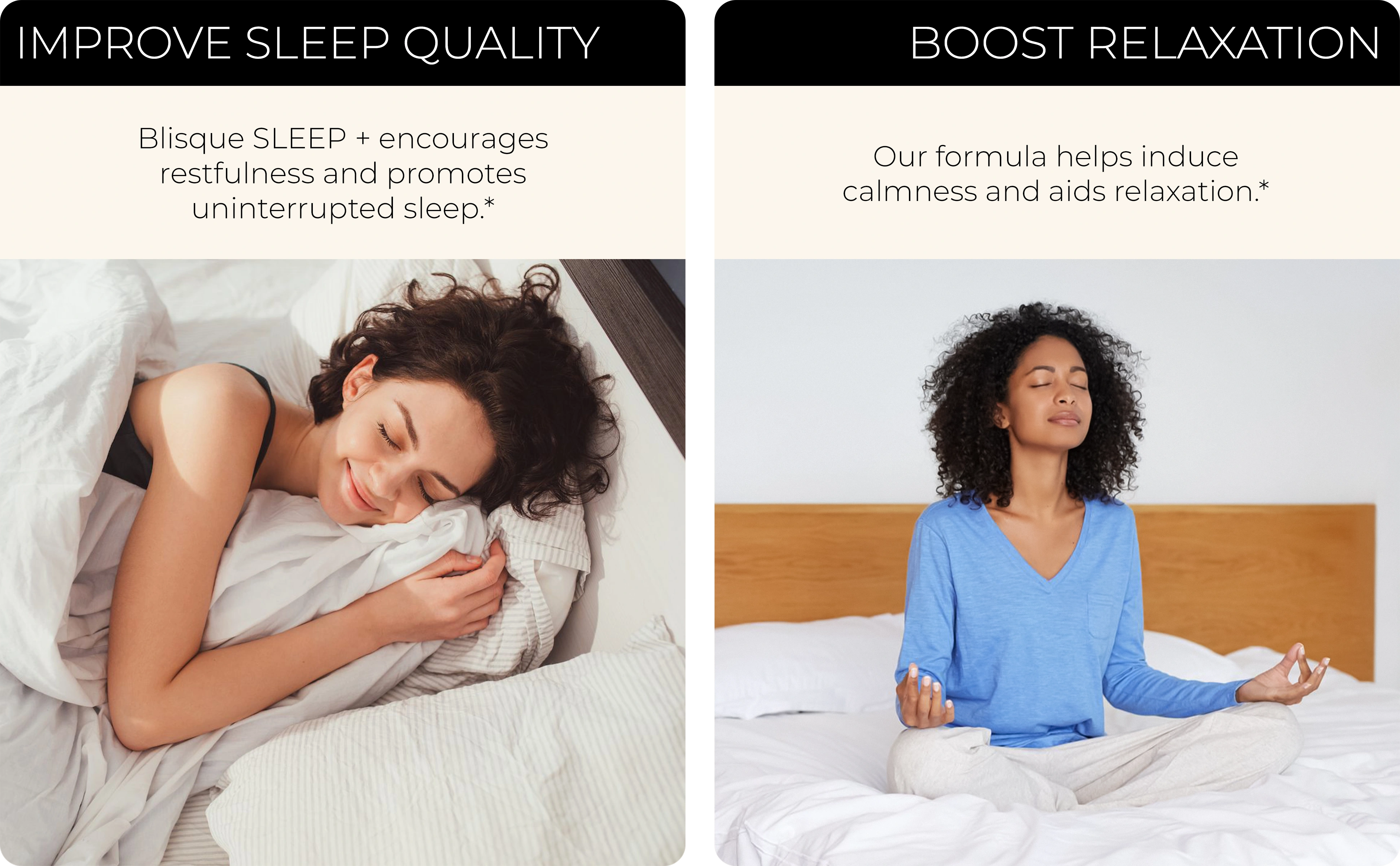 SUPPORT SLEEP QUALITY: Blisque SLEEP + helps you wake up revitalized by supporting a healthy sleep cycle, relaxing the body, and soothing the mind. Our comprehensive sleep supplement promotes better restful sleep.*