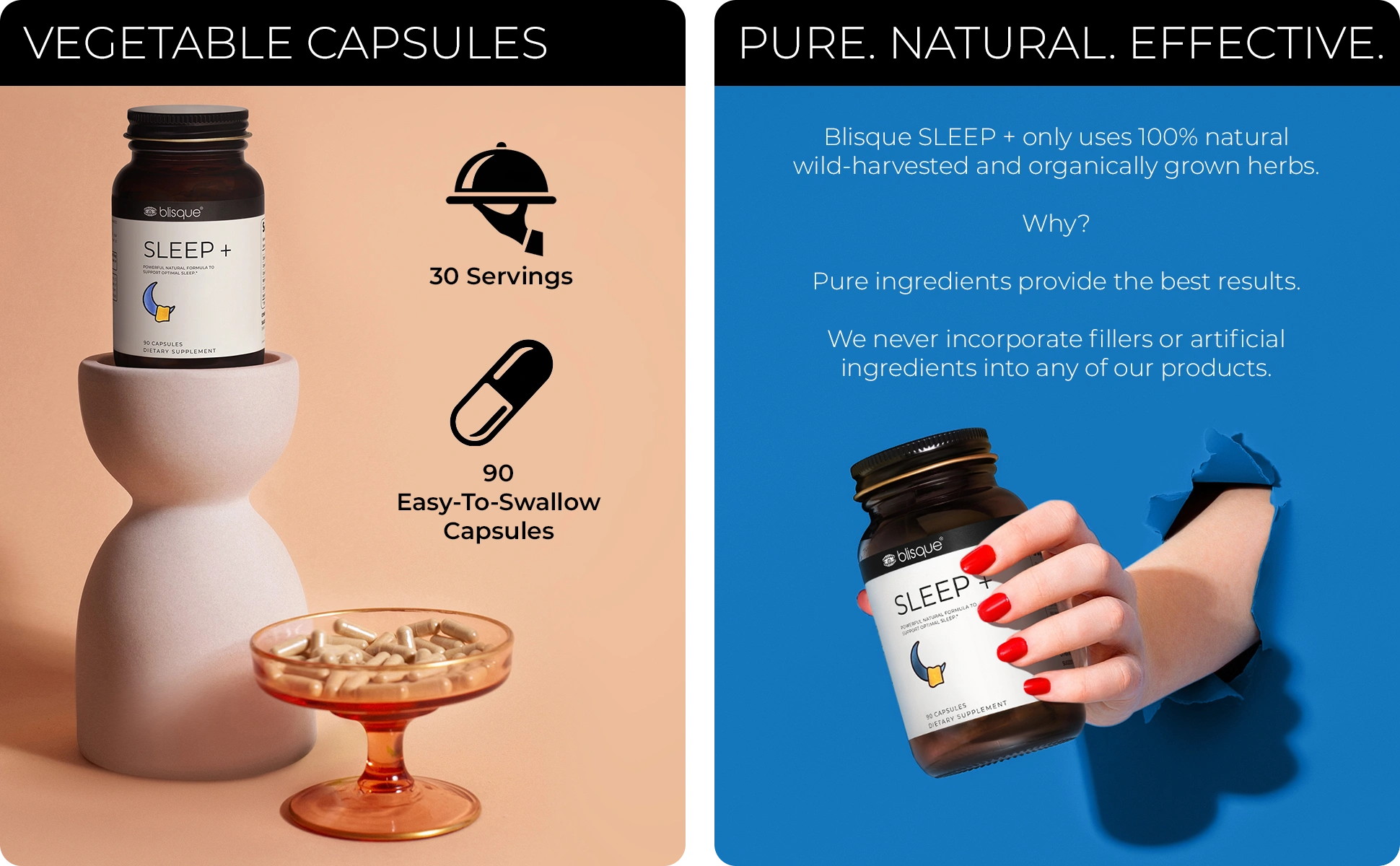 PREMIUM QUALITY: Blisque SLEEP + uses only genuinely natural and organic ingredients that you can feel good about. It's manufactured in the USA in a state-of-the-art certified cGMP NSF facility. We AVOID fillers and harmful components, including animal by-products, artificial colors, artificial preservatives, artificial sweeteners, corn, gluten, magnesium stearate, parabens, soy, silicon dioxide, and wheat. Why? Because your well-being is our priority.