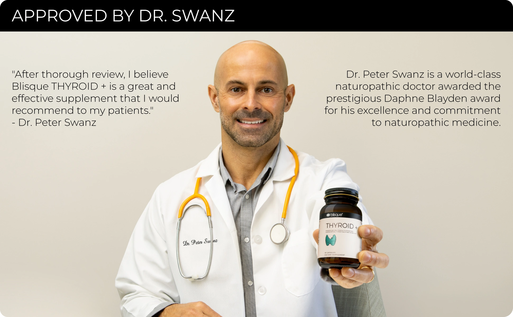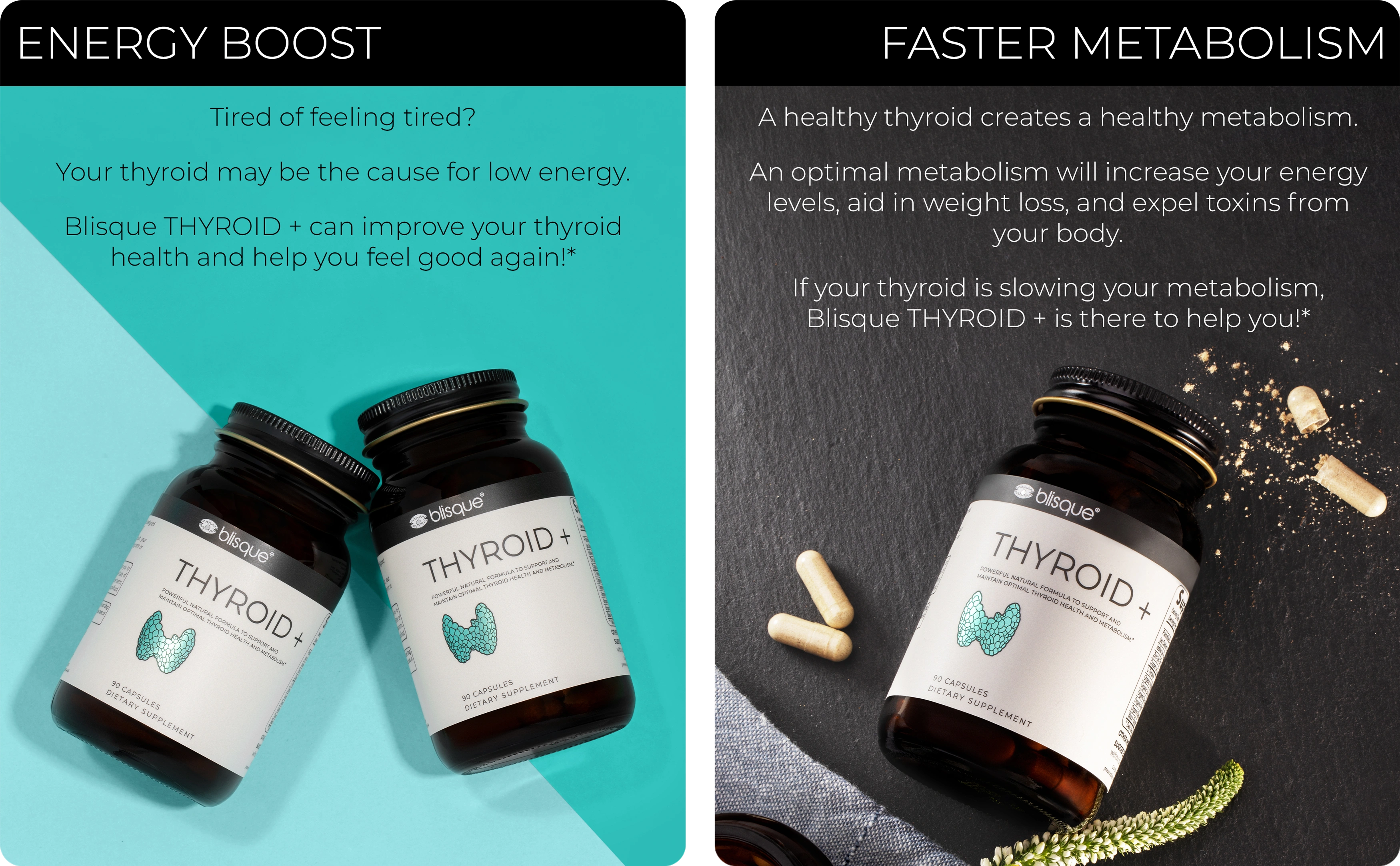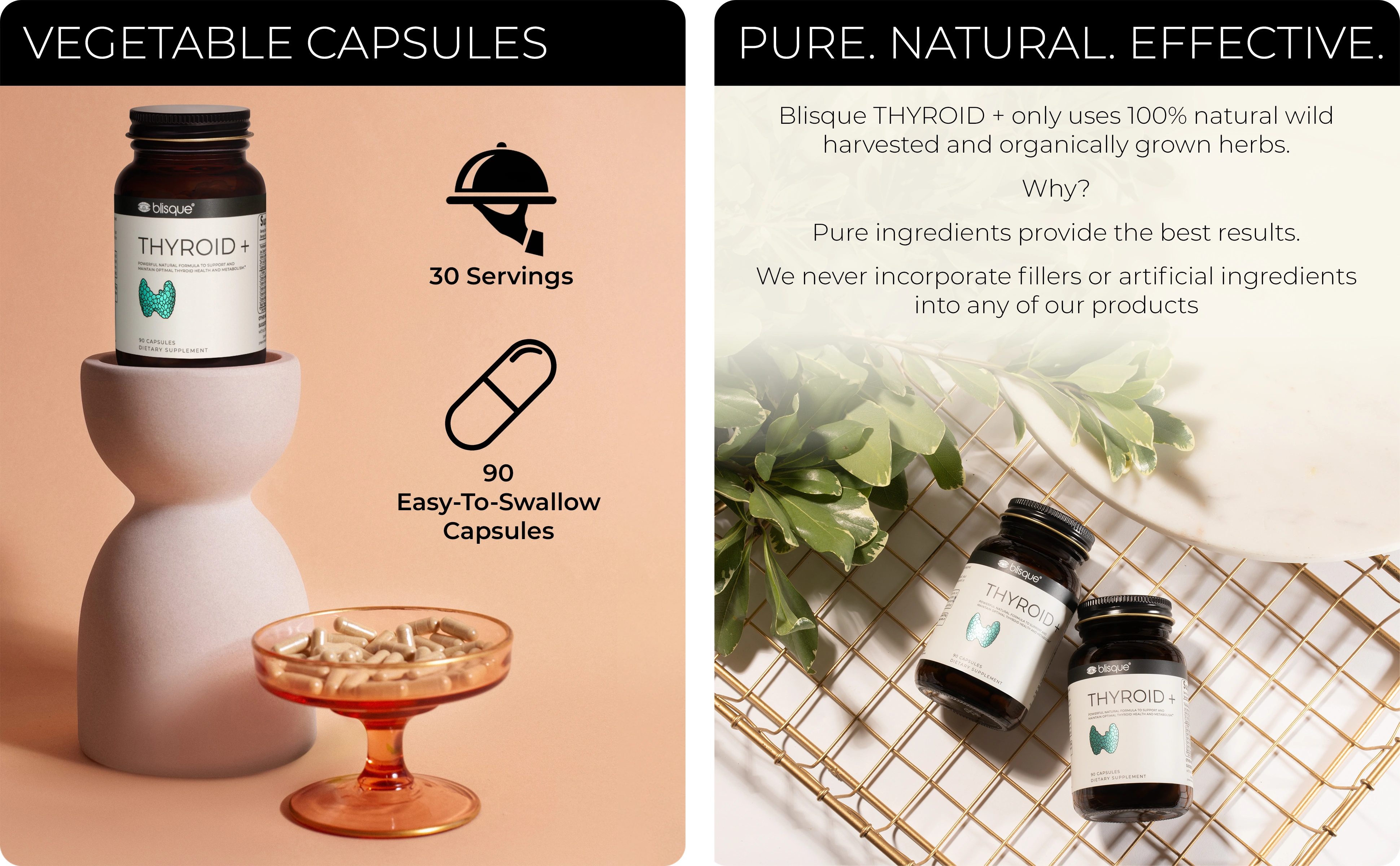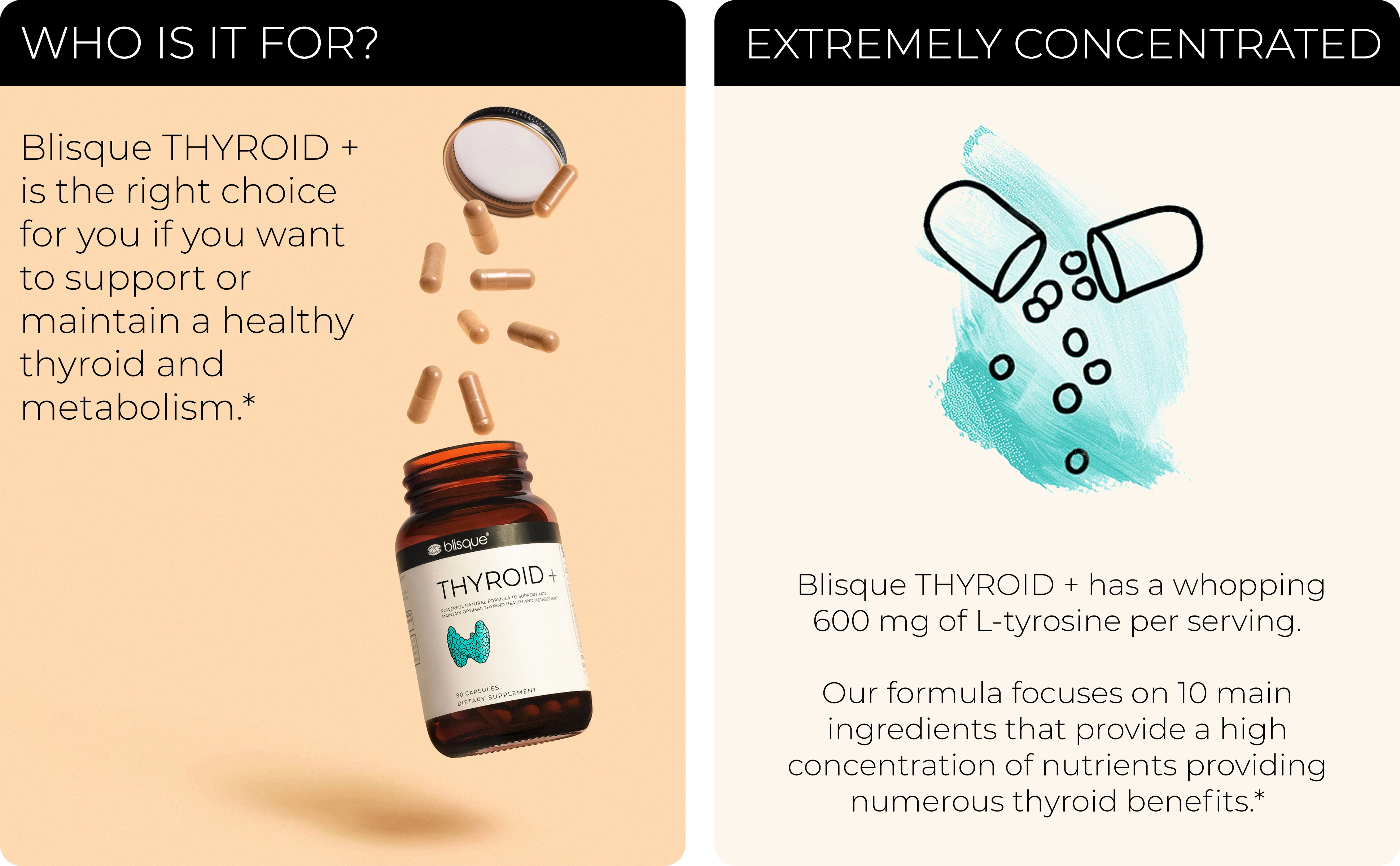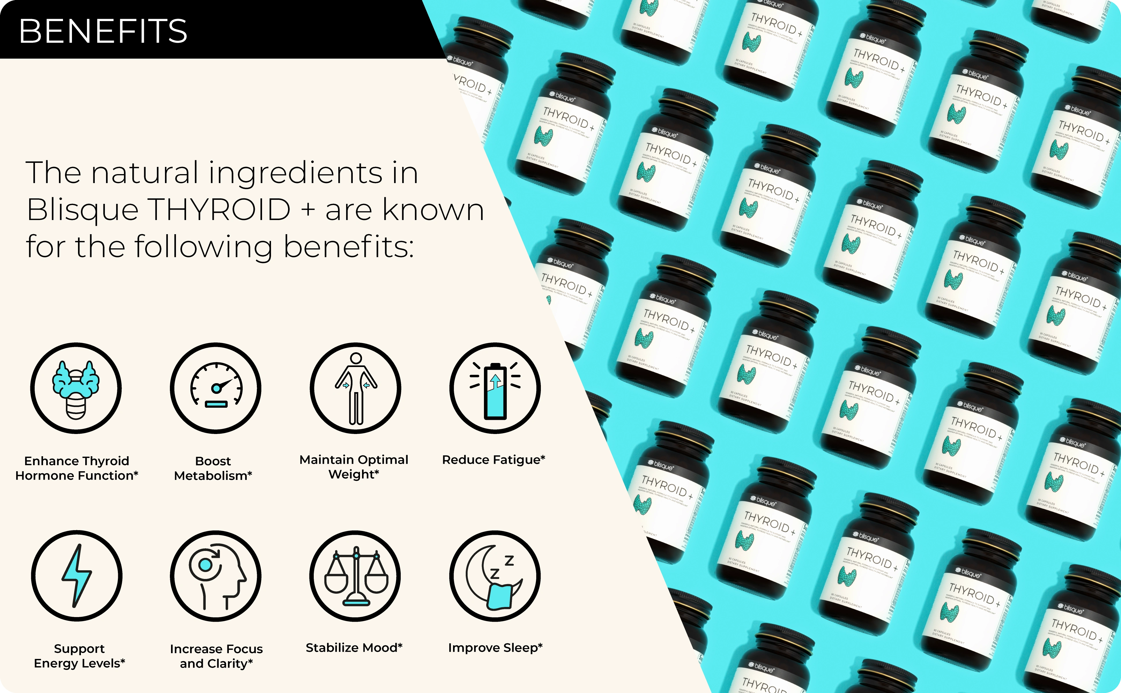 THYROID FUNCTION & WELLNESS: Blisque THYROID + is carefully crafted to help maintain thyroid health and support overall well-being, leaving you feeling balanced and revitalized.*