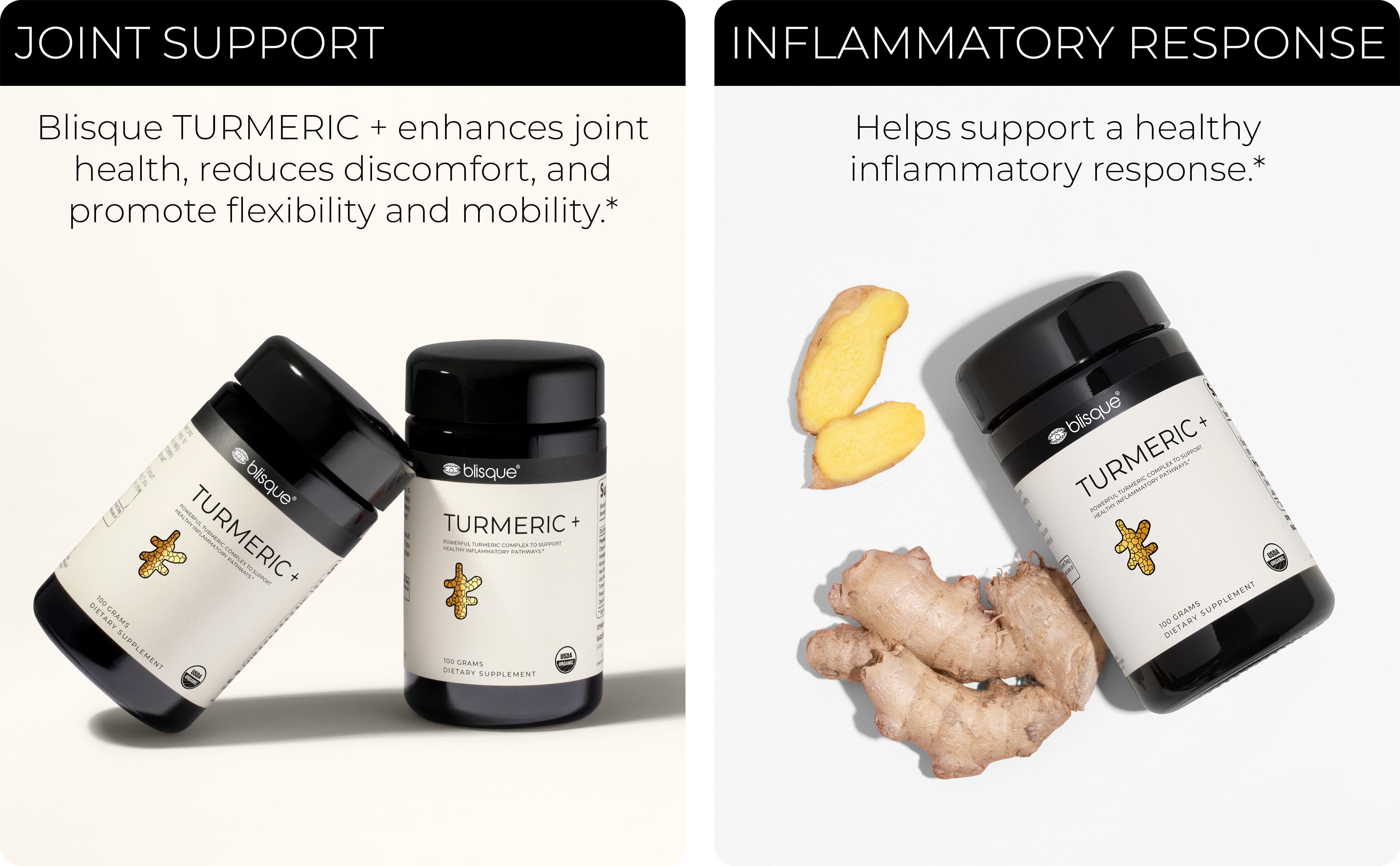 JOINT HEALTH: Blisque TURMERIC + helps give joint comfort and support, easing discomfort and improving flexibility.*