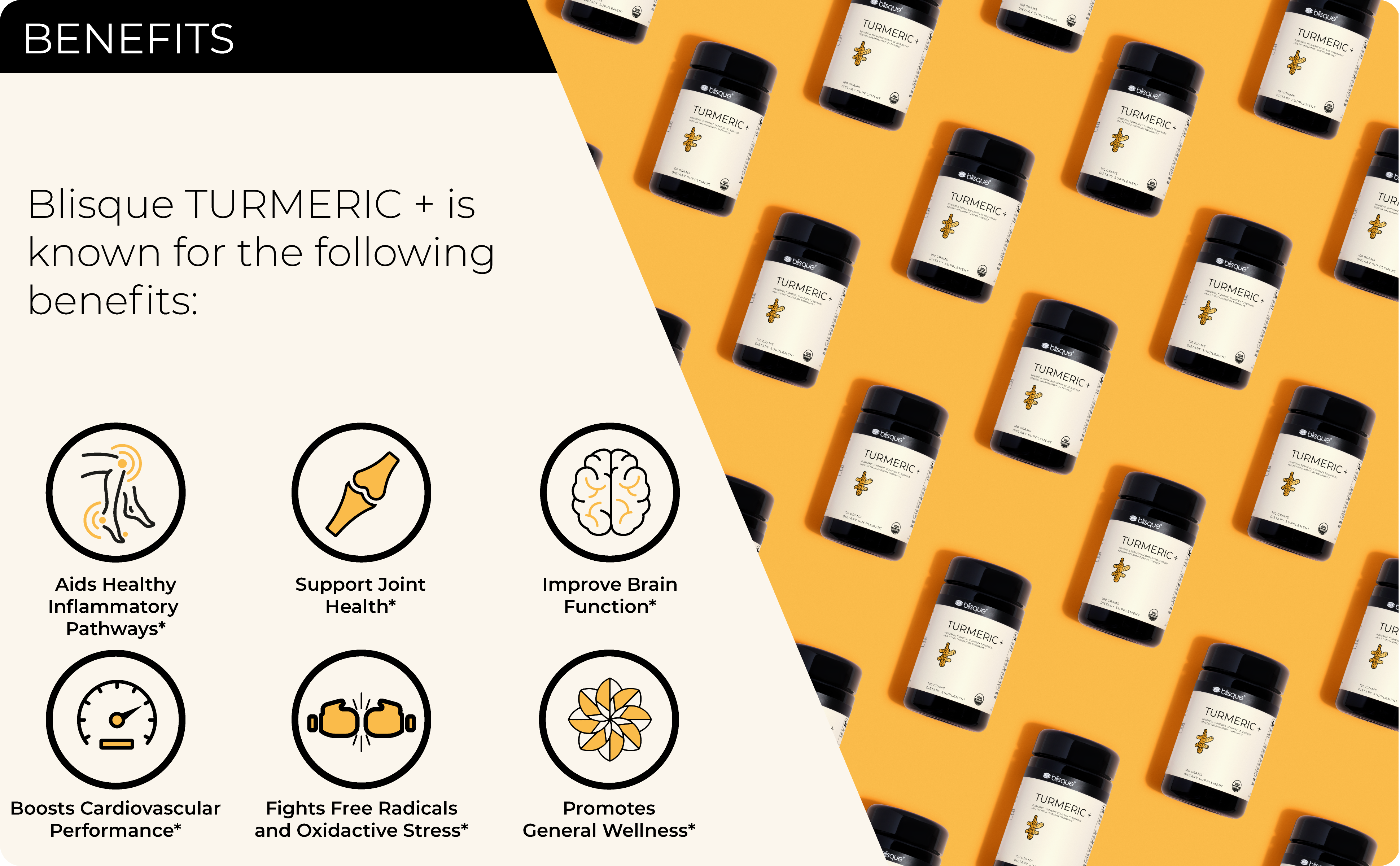 AIDS HEALTHY INFLAMMATORY RESPONSE: Blisque TURMERIC + promotes a balanced inflammatory response and aids healthy inflammatory pathways.*