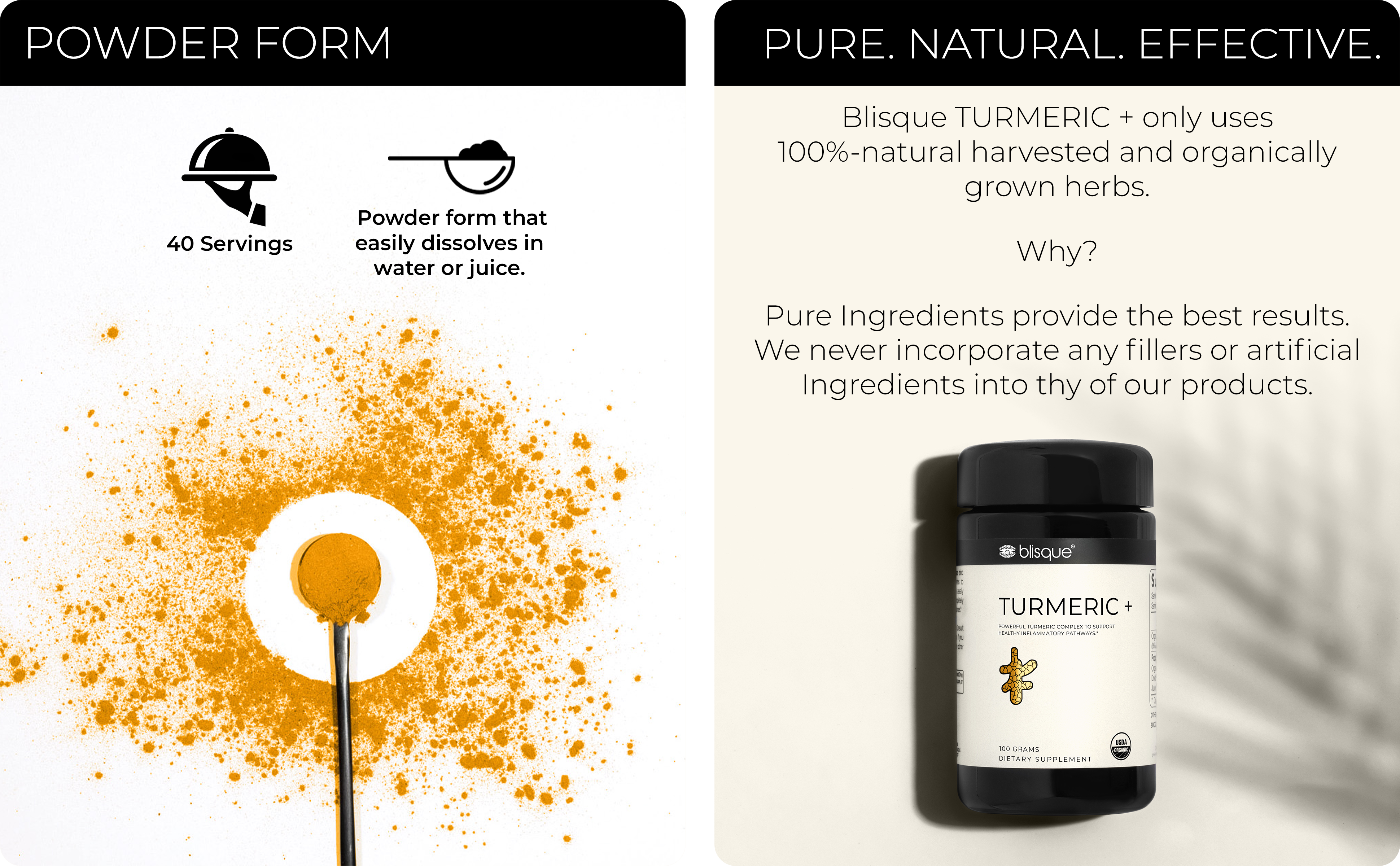 PREMIUM ORGANIC QUALITY: Blisque TURMERIC + is certified organic and uses only genuinely natural and organic ingredients that you can feel good about. It's manufactured in the USA in a state-of-the-art certified cGMP NSF facility. We AVOID fillers and harmful components, including animal by-products, artificial colors, artificial preservatives, artificial sweeteners, corn, gluten, parabens, soy, and wheat. Why? Because your well-being is our priority.