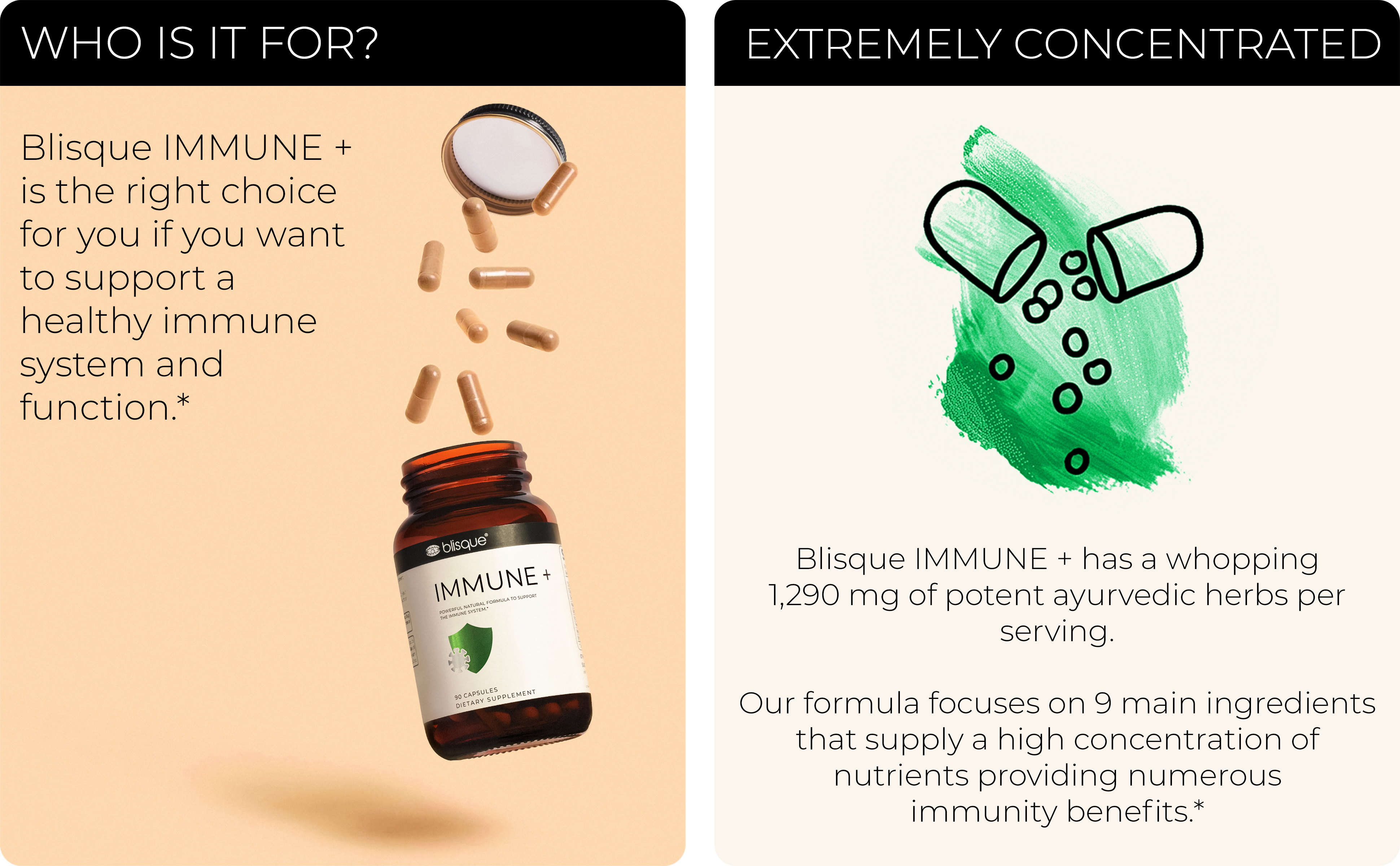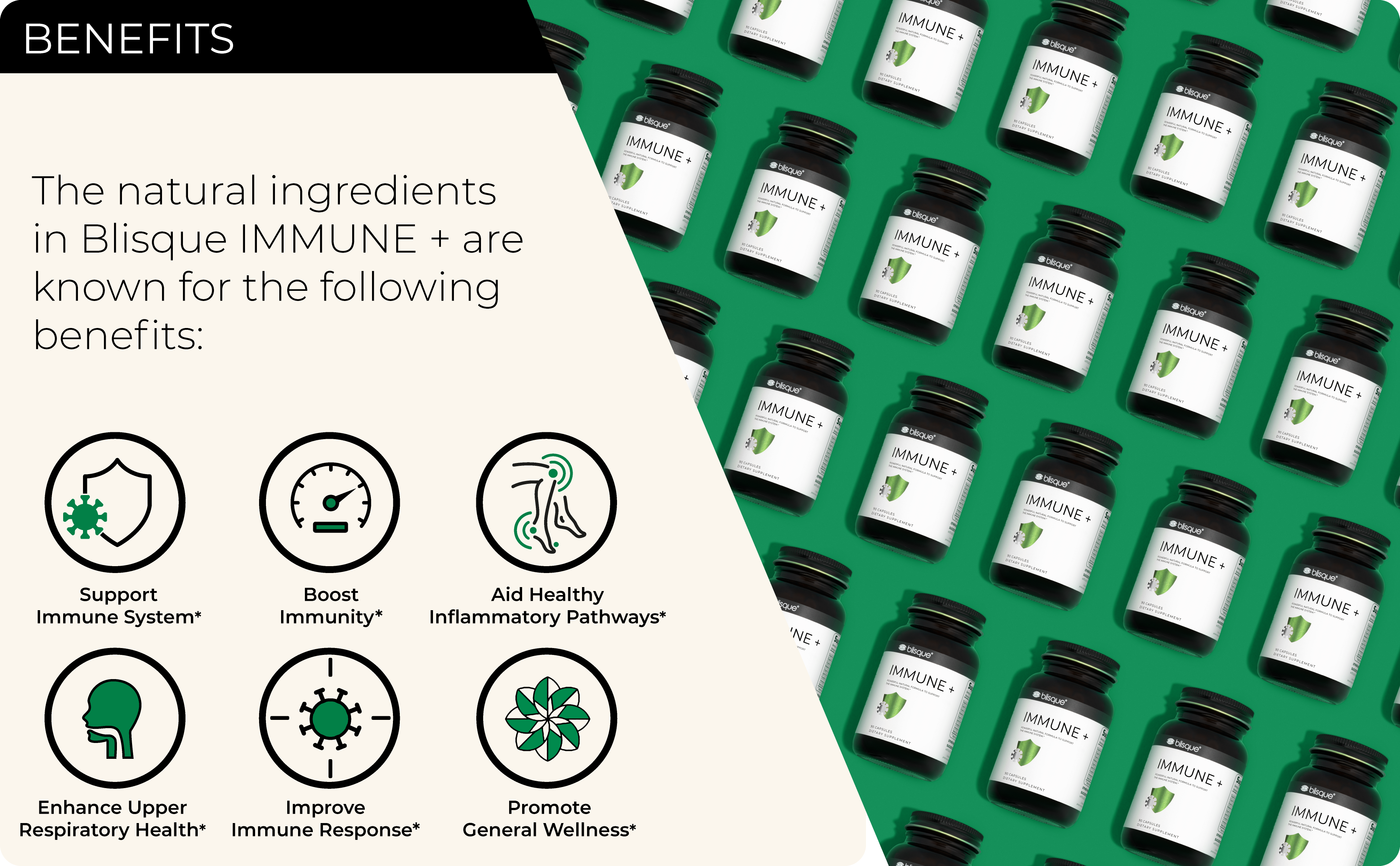 IMMUNE SUPPORT: Blisque IMMUNE + provides your immune system with year-round support for optimal immune health and function. Take IMMUNE + every day to keep the doctor away!*