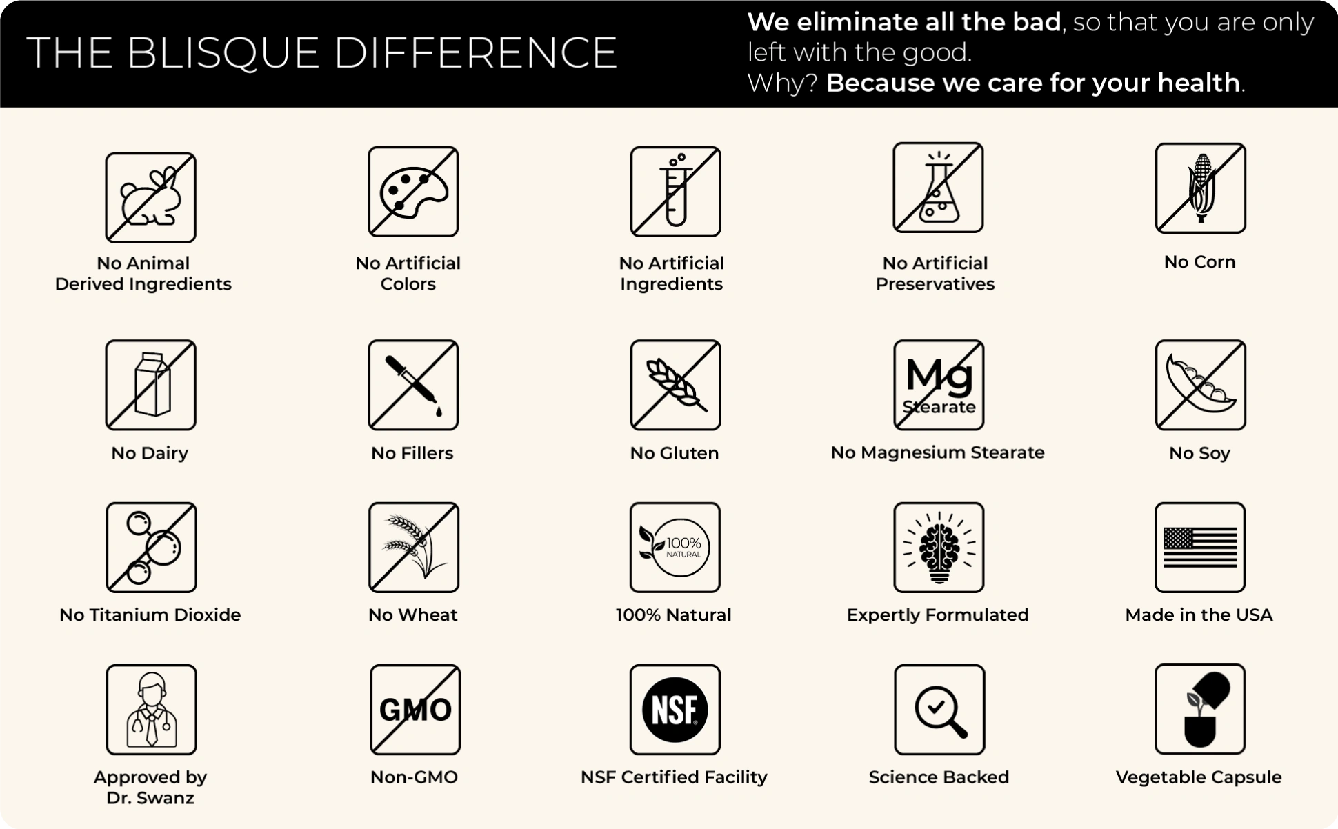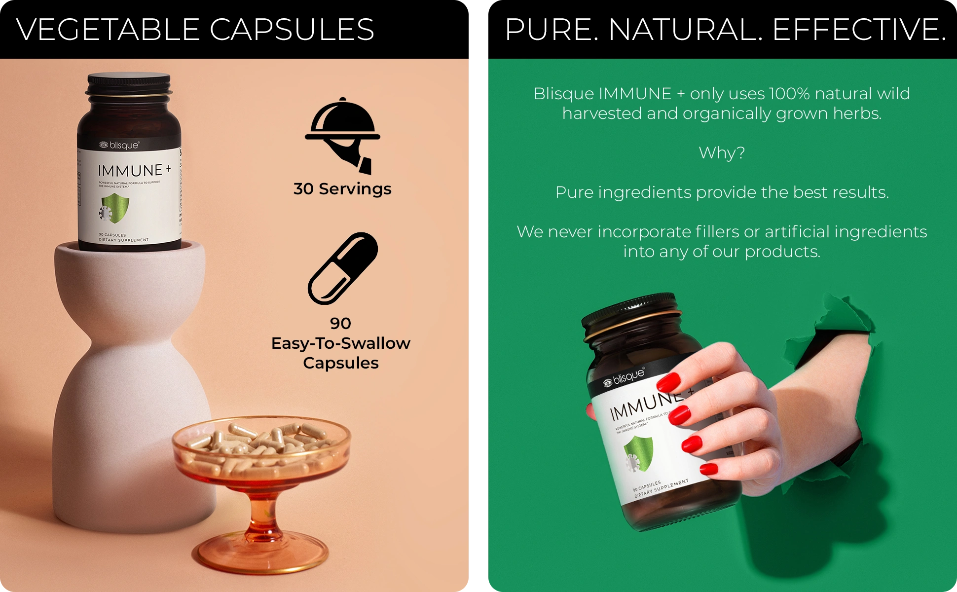 PREMIUM ORGANIC QUALITY: Blisque IMMUNE + uses only genuinely natural and organic ingredients that you can feel good about. It's manufactured in the USA in a state-of-the-art certified cGMP NSF facility. We AVOID fillers and harmful components, including animal by-products, artificial colors, artificial preservatives, artificial sweeteners, corn, gluten, magnesium stearate, parabens, soy, silicon dioxide, and wheat. Why? Because your well-being is our priority.