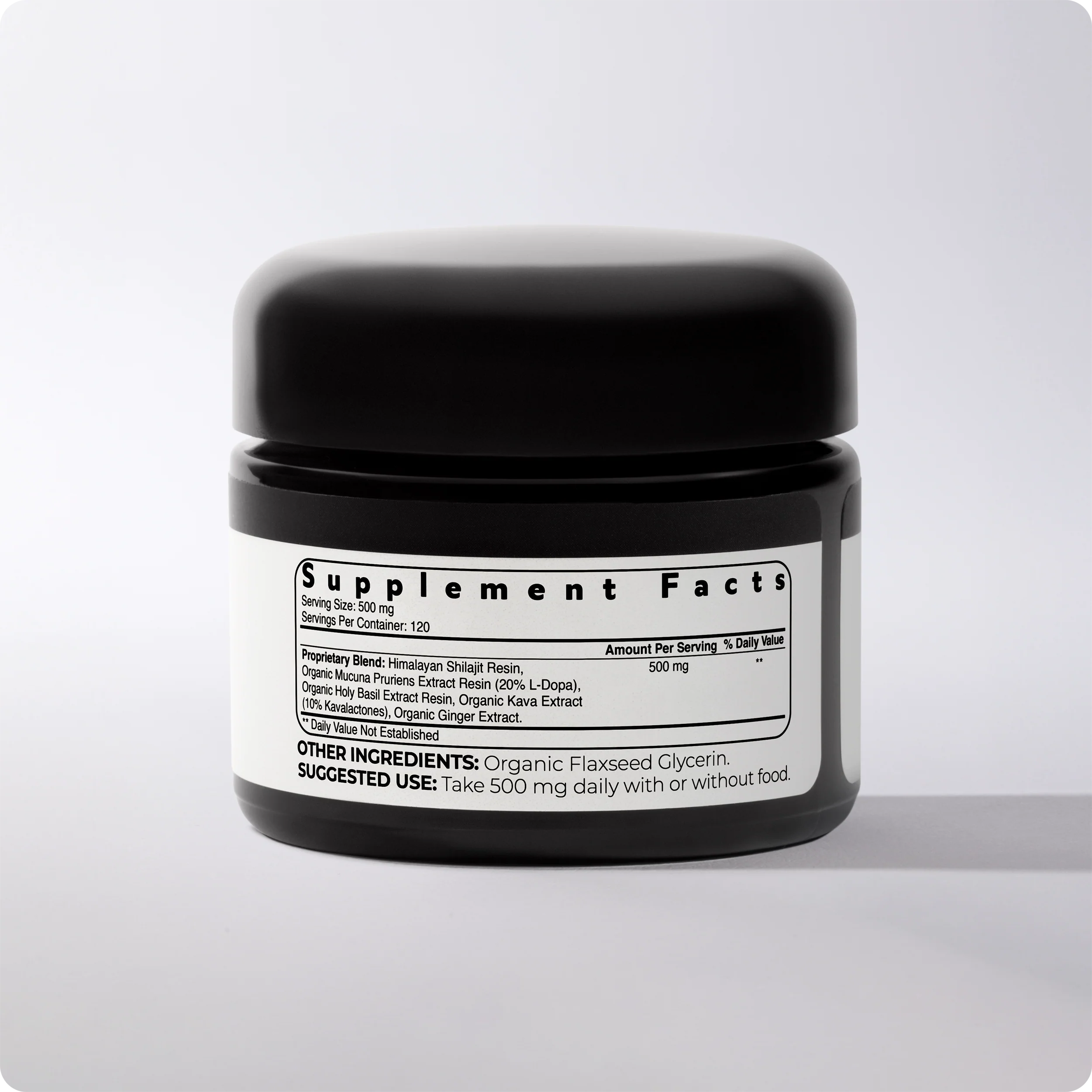 Himalayan Shilajit Resin, Organic Ashwagandha Extract Resin, Organic Moringa Extract Resin, Organic Flaxseed Glycerin, Organic Ginger Extract.