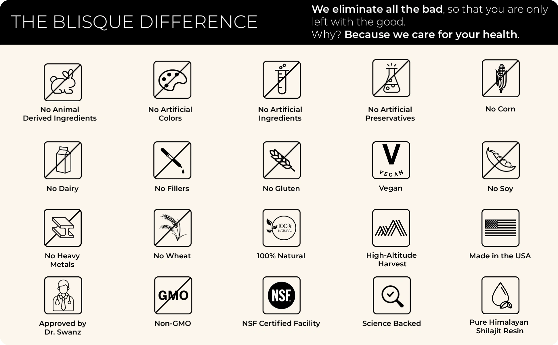 AUTHENTIC AND NATURAL: Blisque SHILAJIT + uses the finest authentic wild-harvested shilajit resin on the planet. Sourced at over 17,000 feet of elevation in the Indian Himalayas and manufactured in the USA in a state-of-the-art certified cGMP NSF facility. Our pure and potent shilajit resin is China-free, filler-free, additive-free, and free of hidden ingredients. Why? Because your well-being is our priority.